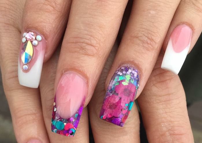 - Un motif volumétrique avec l'utilisation de fleurs séchées avec des paillettes ne laissera pas les natures romantiques indifférentes.