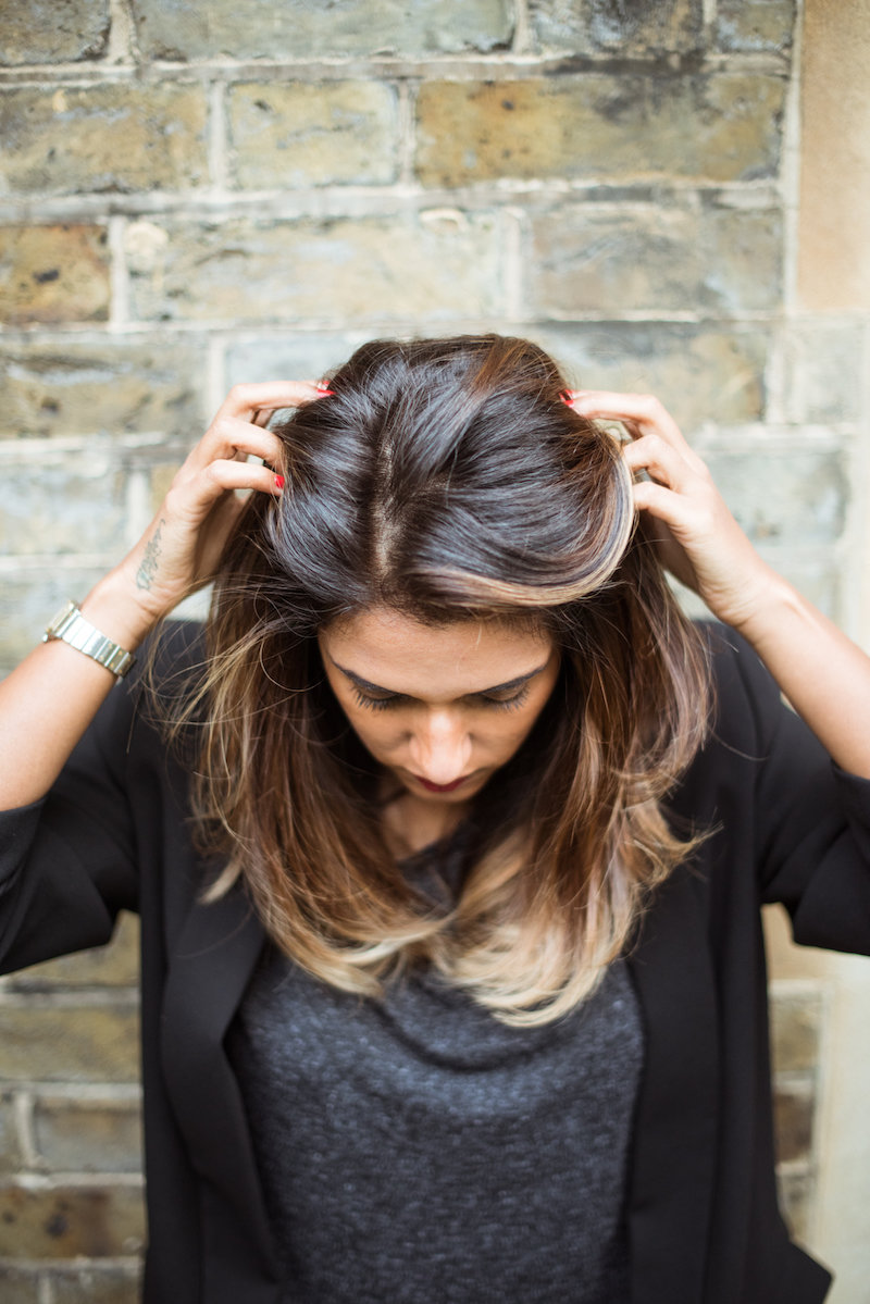Vous pouvez également corriger certaines zones. Par exemple, si vous avez un carré, transformez les extrémités avec vos mains. Pour cela, récupérez le carré en un chignon à l'arrière de la tête, appliquez le pigment avec vos doigts et répartissez-le avec un peigne.