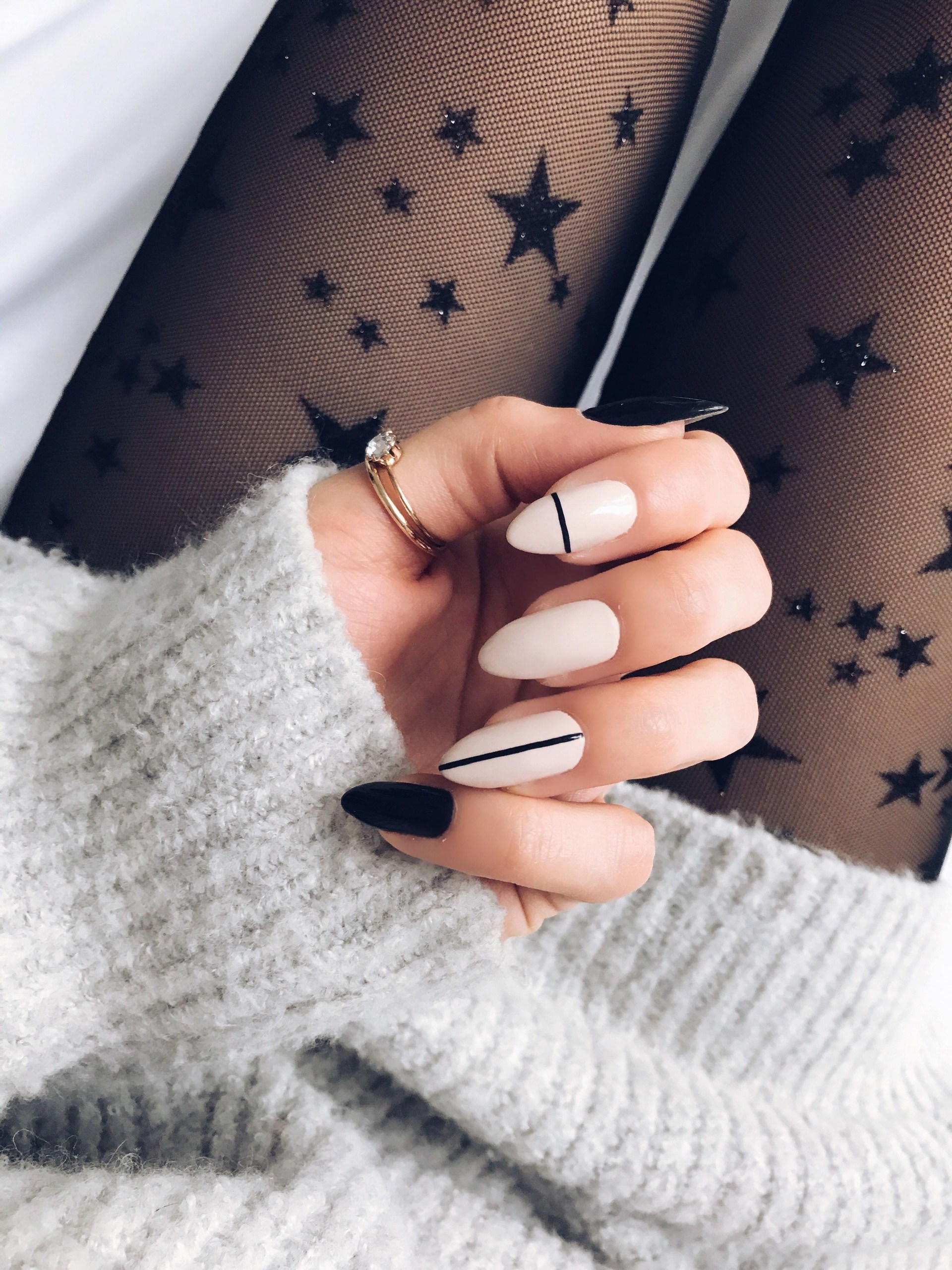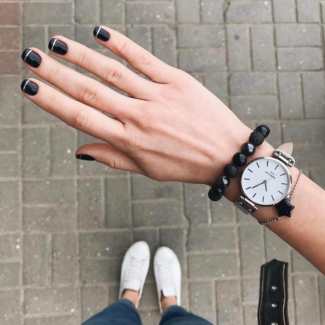 L’opció més senzilla, que es pot fer fins i tot a casa, és decorar-la amb una o dues línies contrastades. Però quan voleu alguna cosa més interessant i més difícil, no podeu prescindir de la inspiració fotogràfica de les fashionistes de tot el món.