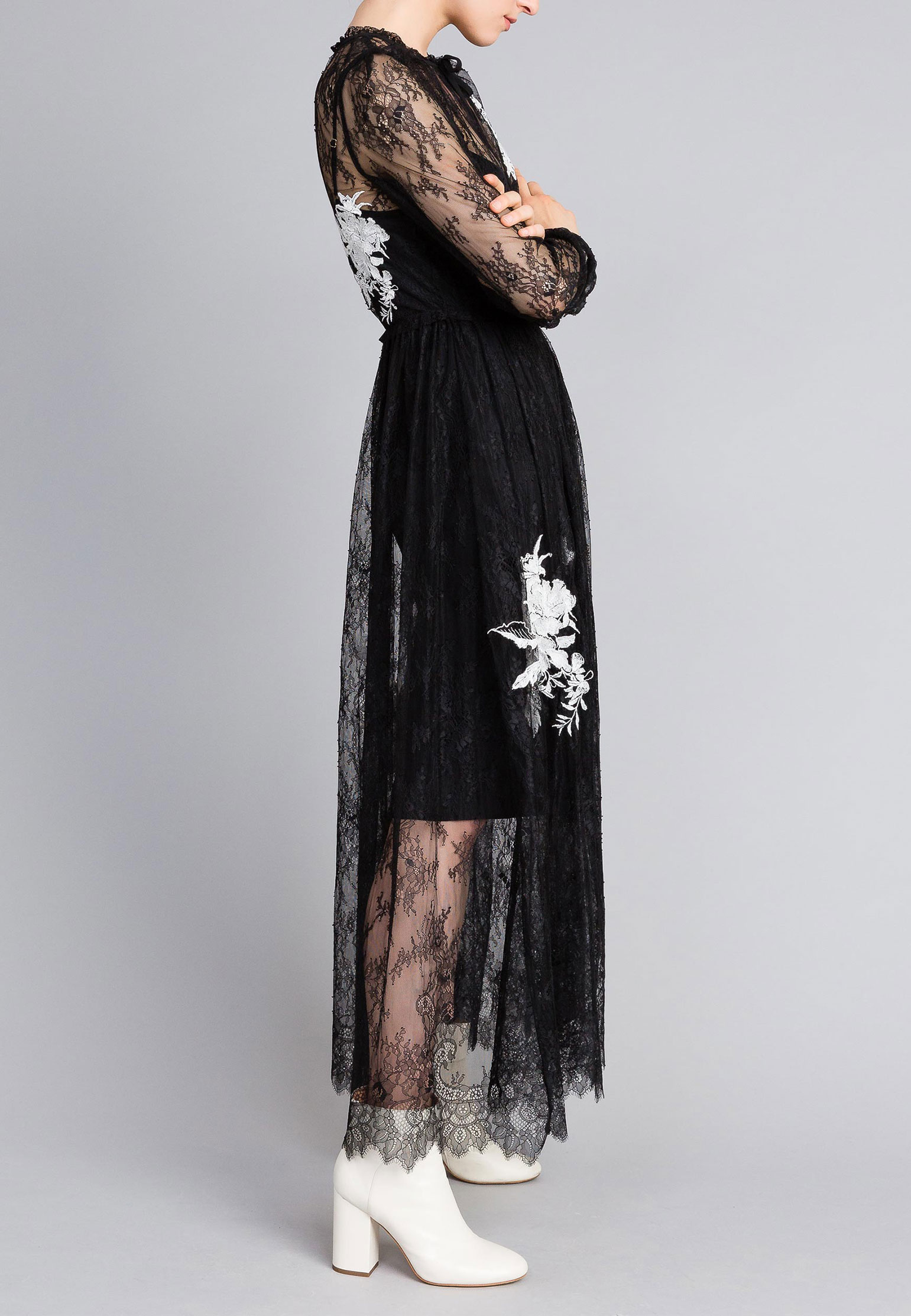 Pour les audacieux, translucides dentelle au sol avec doublure inférieure au genou. C'est idéal pour une construction gracieuse. Il est possible de décorer avec une ceinture en satin, ainsi que des manches au coude ou aux poignets.