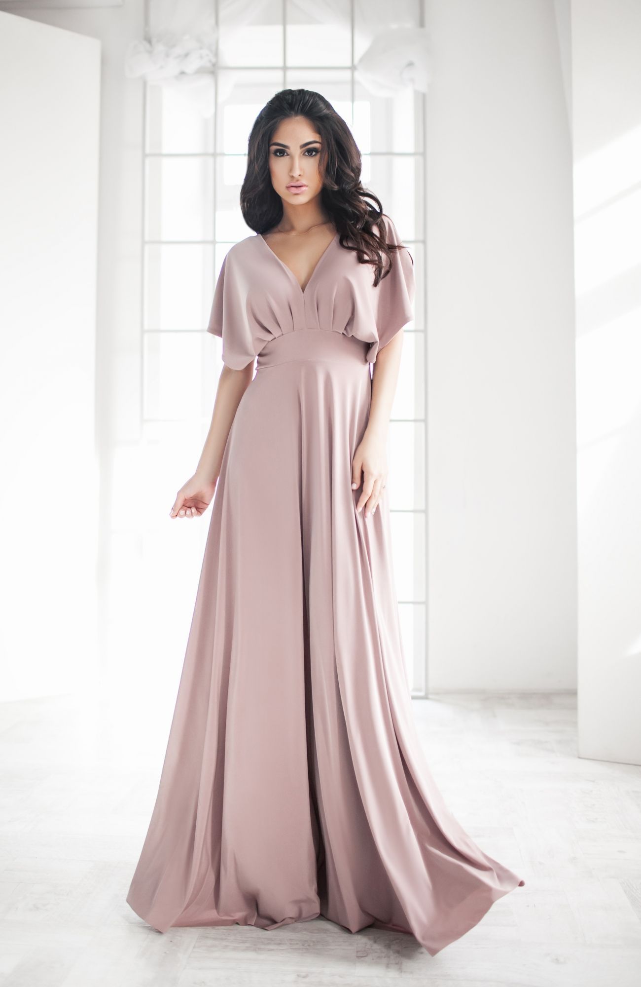 Maxi šaty mají nejčastěji splývavý střih a létající podlahy.Shora pod hrudníkem je zachycuje elegantní pásek. Rozšířené rukávy vypadají krásně. Svůdná prsa je zdůrazněna lodičkovým výstřihem, hlubokým ve tvaru písmene V nebo nabíraným gumičkou a nataženým na holých ramenou. Model může být rovný, mírně nebo silně rozšířený. Záleží na struktuře věci. Na některých vypadají záhyby a závěsy obzvláště delikátně.
