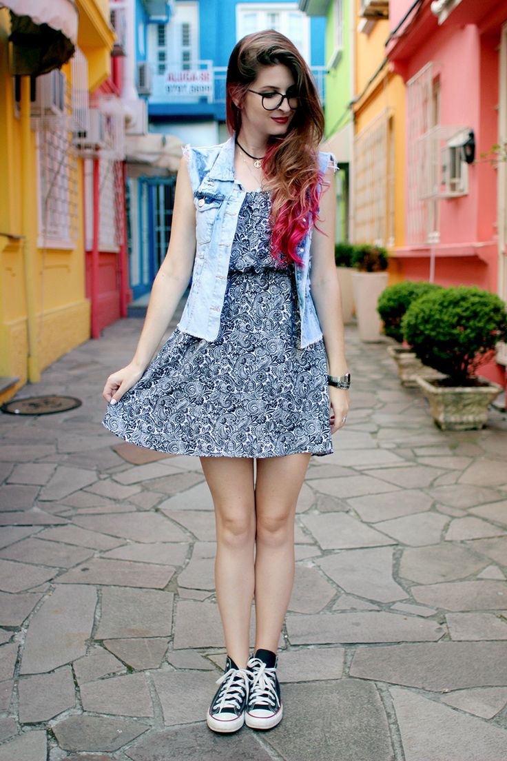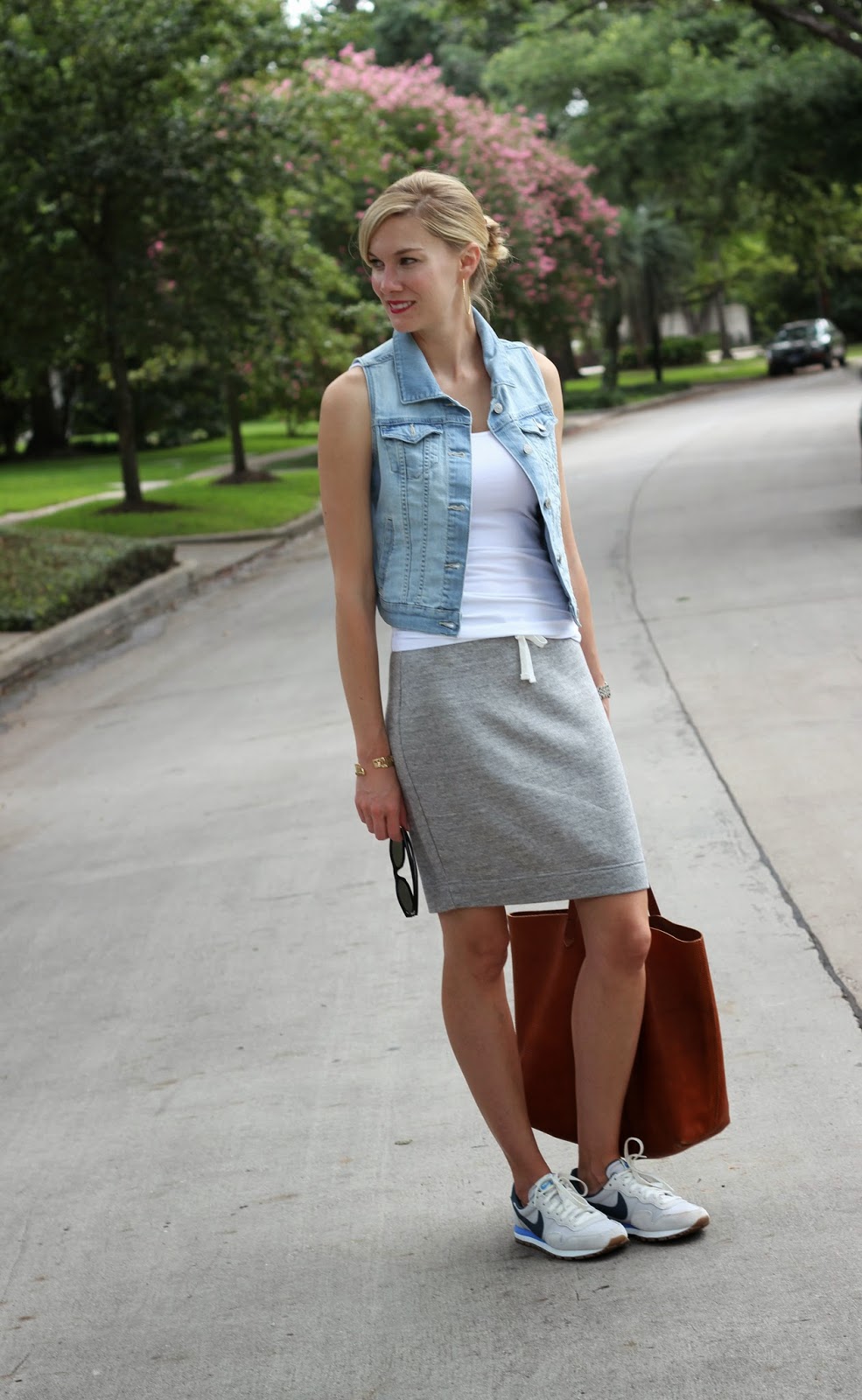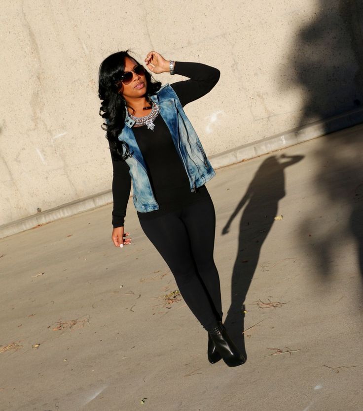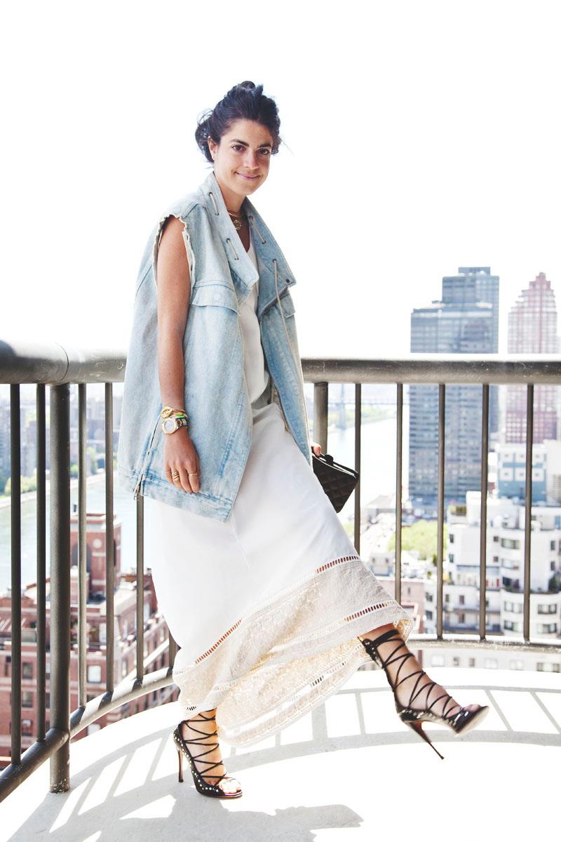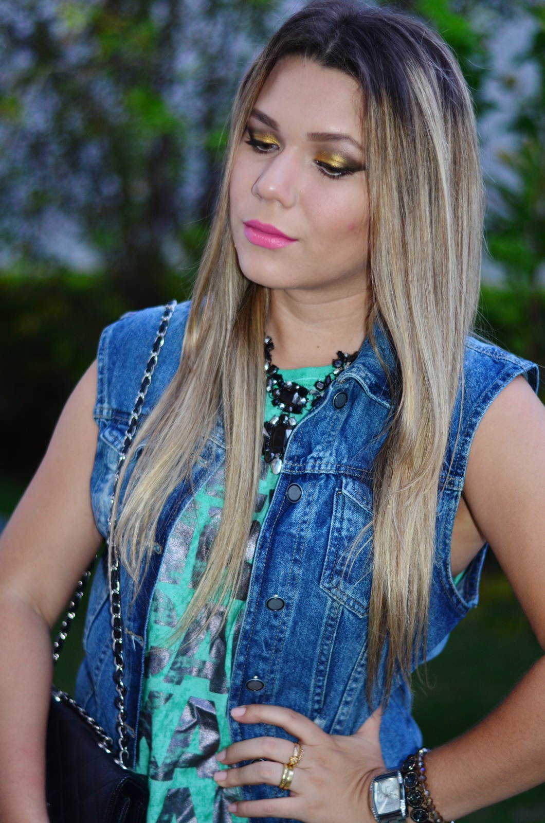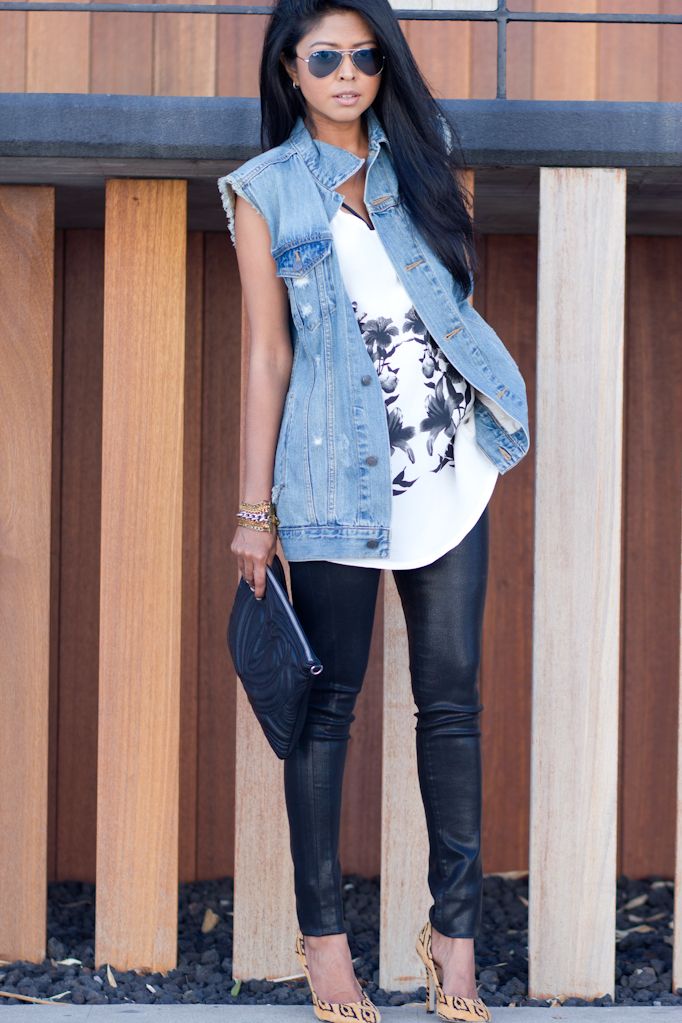 - Un look dans l'esprit du glamour urbain chic : un tee-shirt oversize à motifs animaliers, une jupe courte en jean et un gilet.