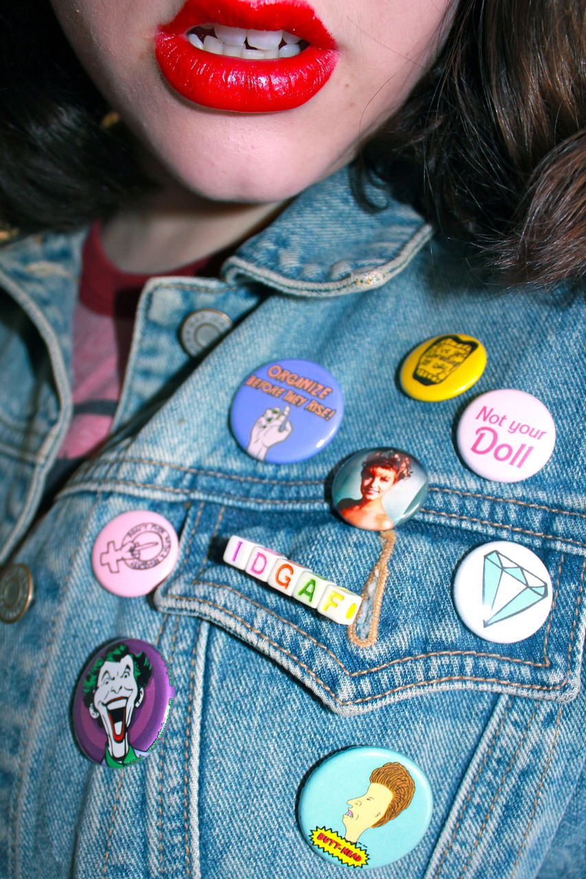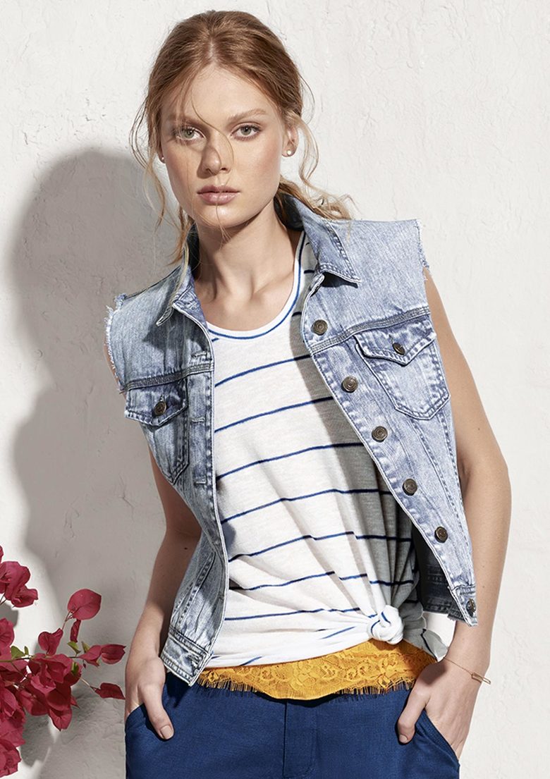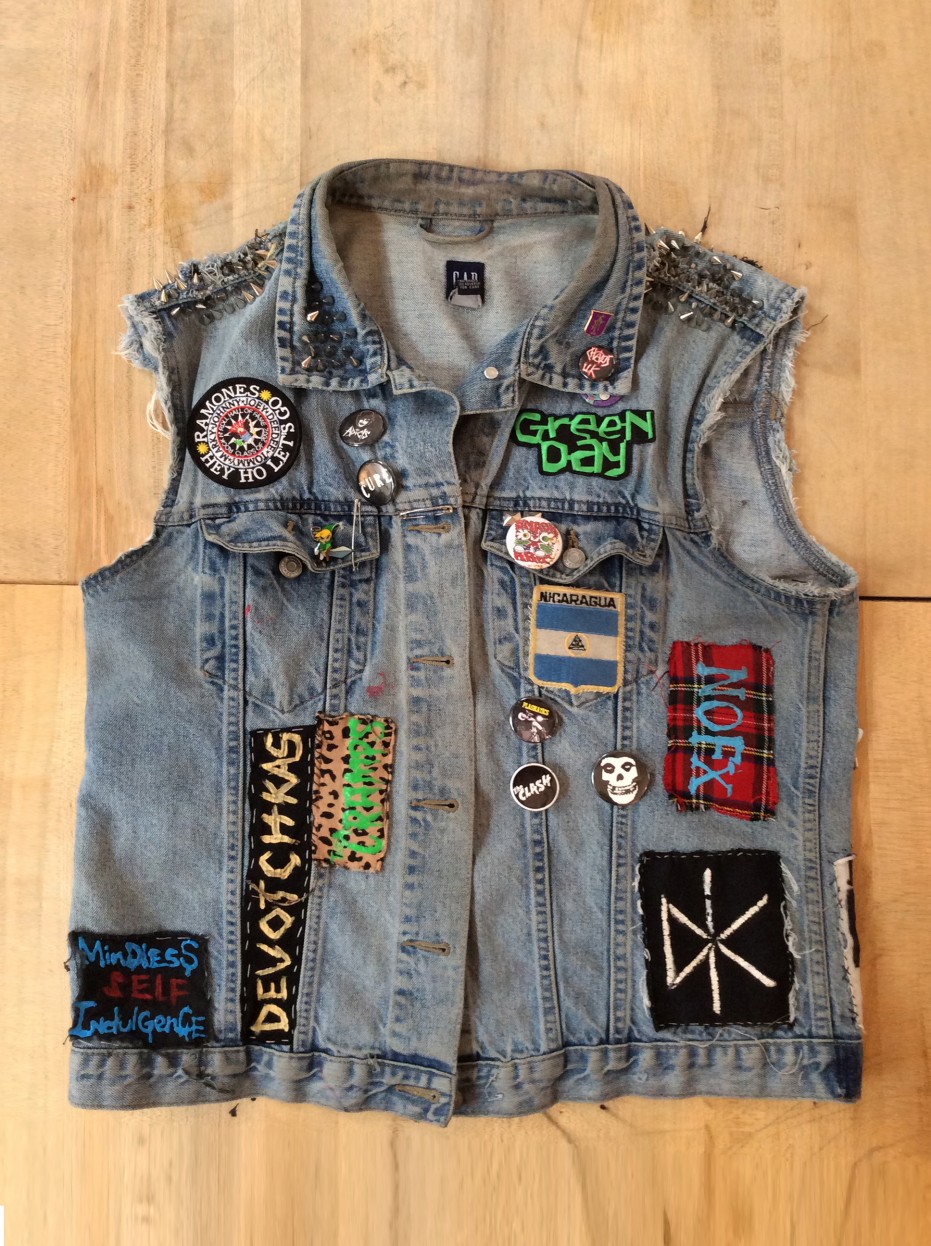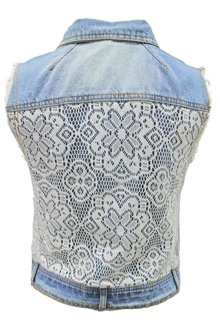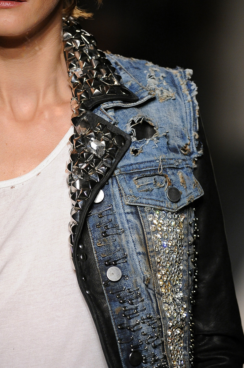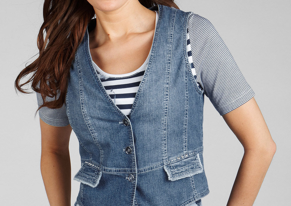 Il y a aussi des rivets et des boutons en métal. Ils, comme rien d'autre, s'intègrent harmonieusement dans le tableau d'ensemble avec le denim. Ces derniers, d'ailleurs, sont très difficiles à attacher, il est donc préférable de privilégier les boutons gracieux. Ici, vous pouvez révéler toutes vos compétences de décorateur. Laissez un grand crâne afficher sur le dos, et un col montant est indiqué devant.