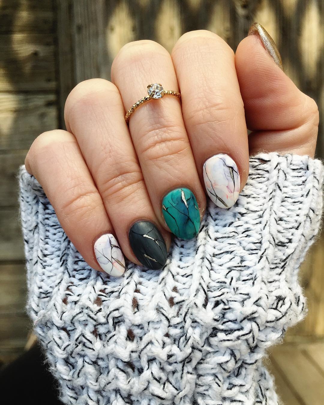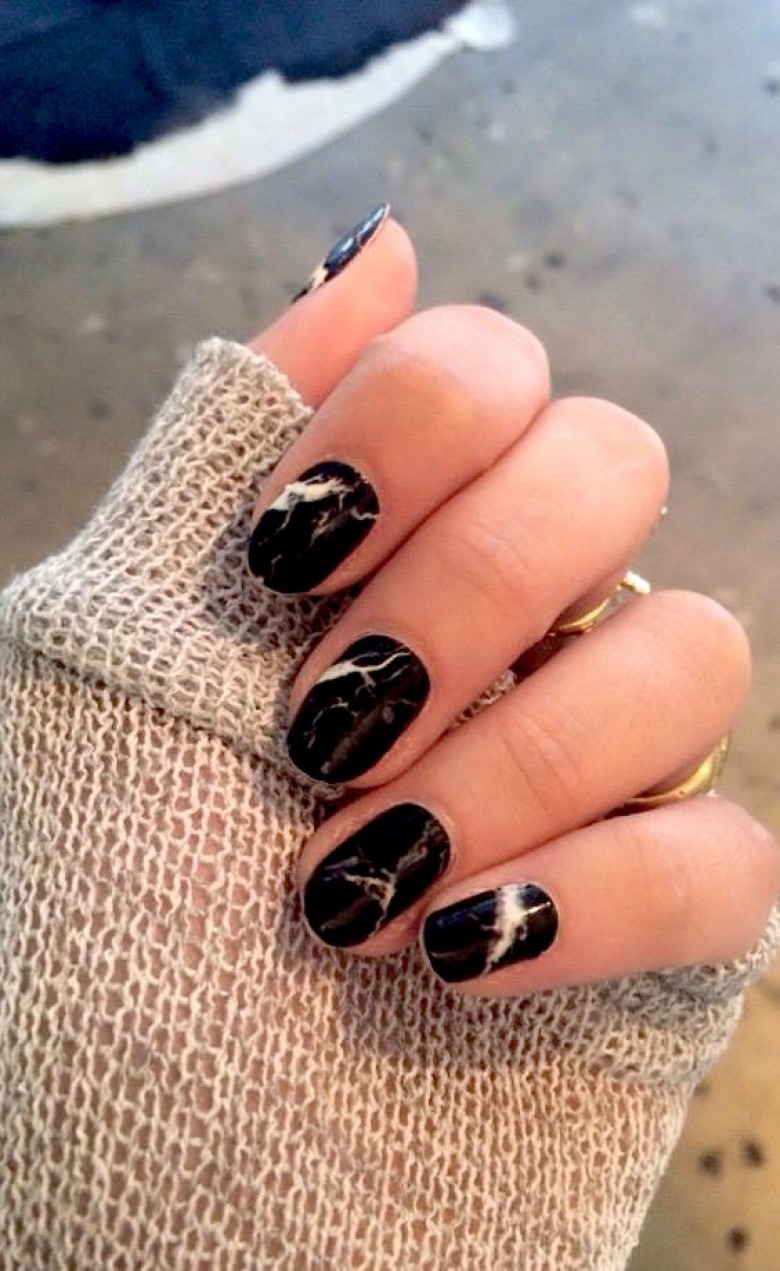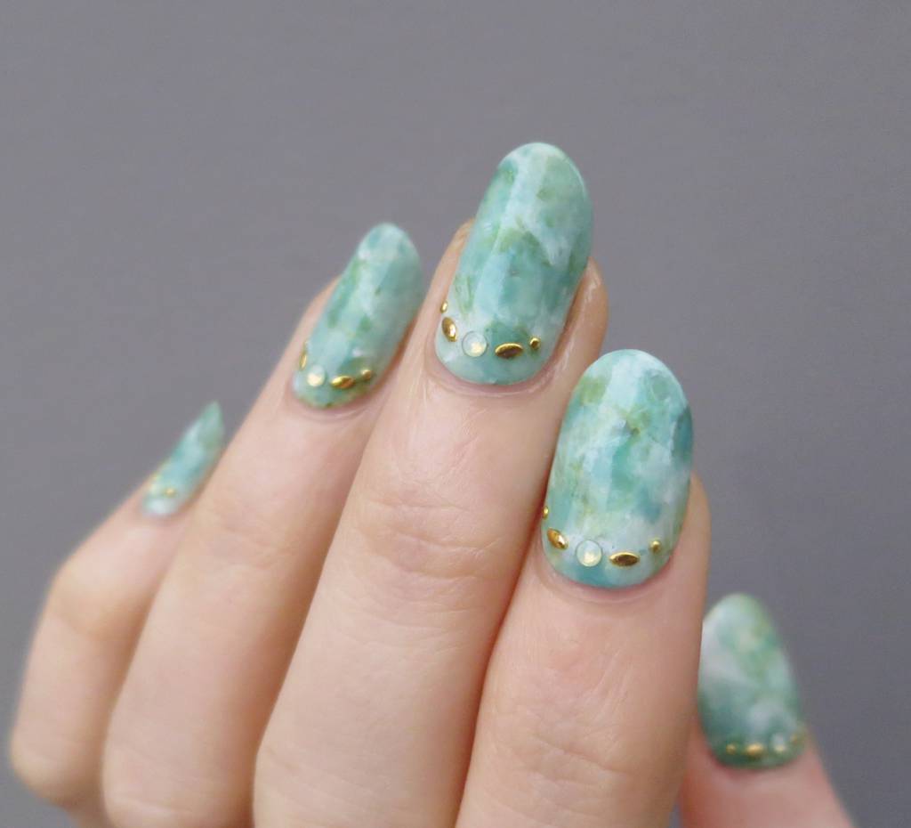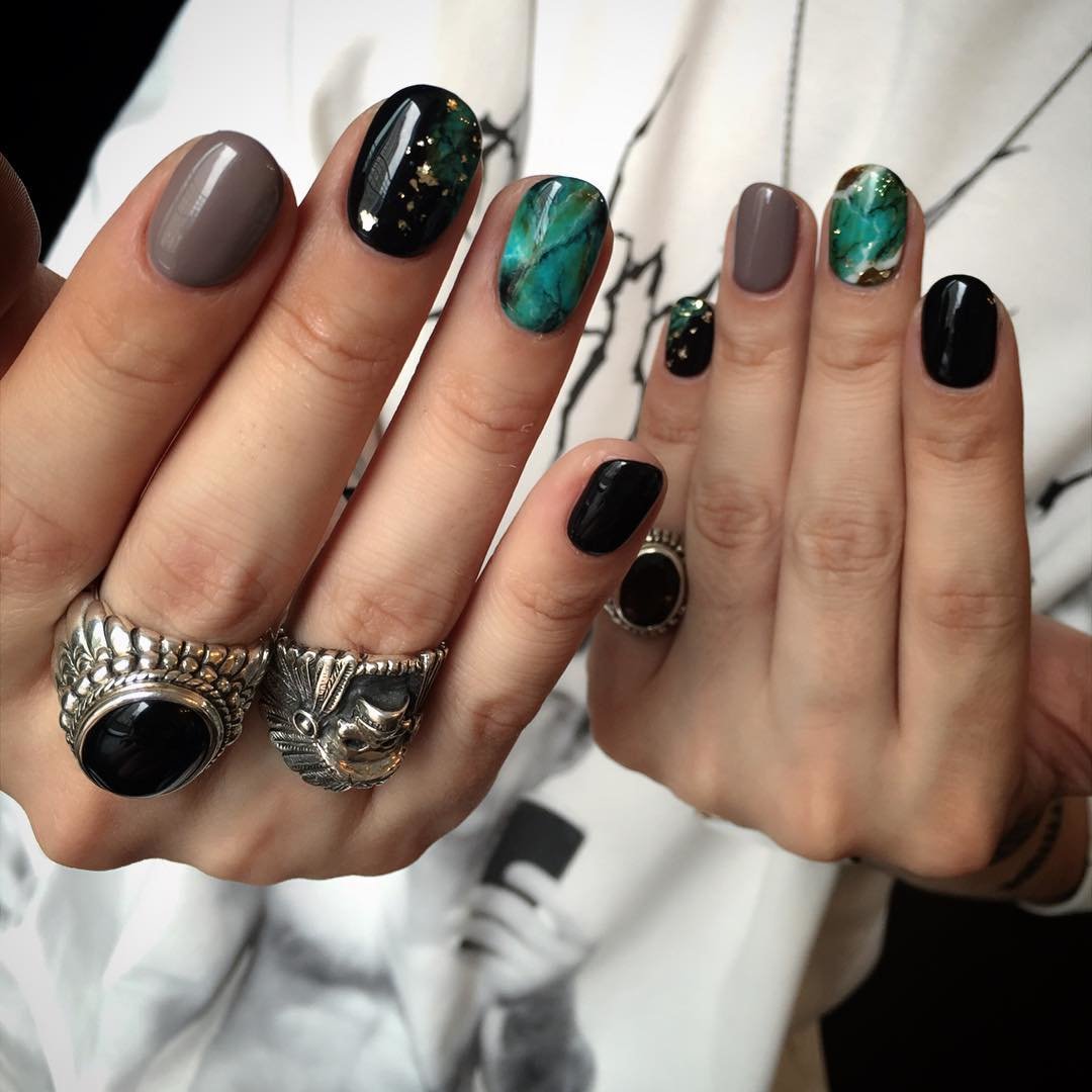 Consider a simple example on marble ornaments. Now stylists recommend moving away from long nails, according to their assurances, the optimal size of the regrown tip should be about 3-5 millimeters. At the same time, the most natural shape is preserved - oval or almond-shaped. That is, the striving for harmony with nature is still preserved. But the now fashionable emerald palette does not fit into these frames at all, especially when the girls complement it with cracks of gilding and silver. Hence the conclusion: stone nail art makes it possible for bright and extravagant natures to fully express their inner world and show a sense of style, while remaining at the peak of current trends.