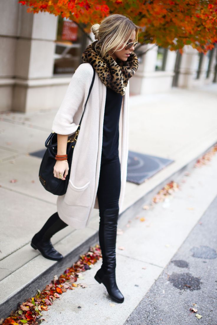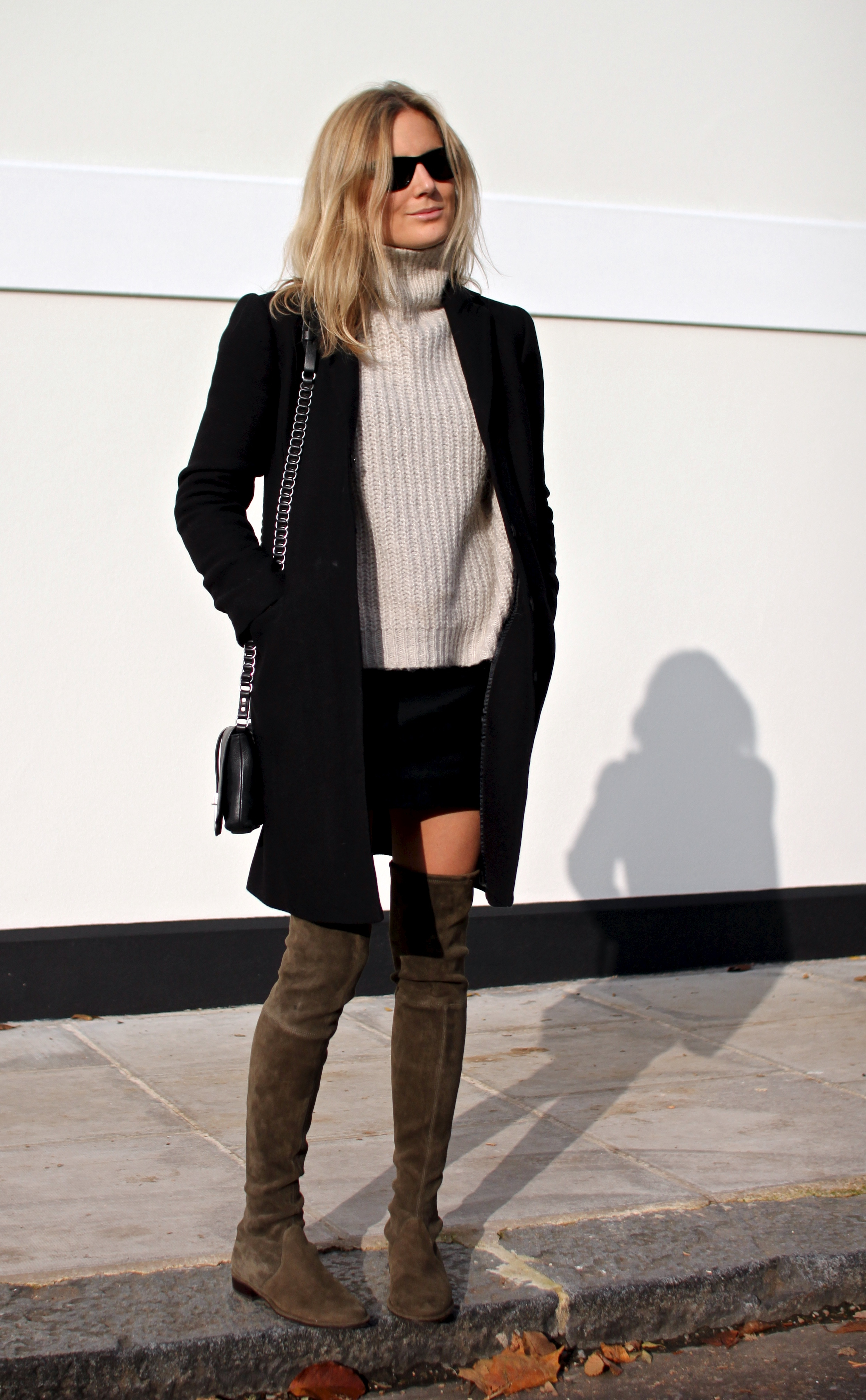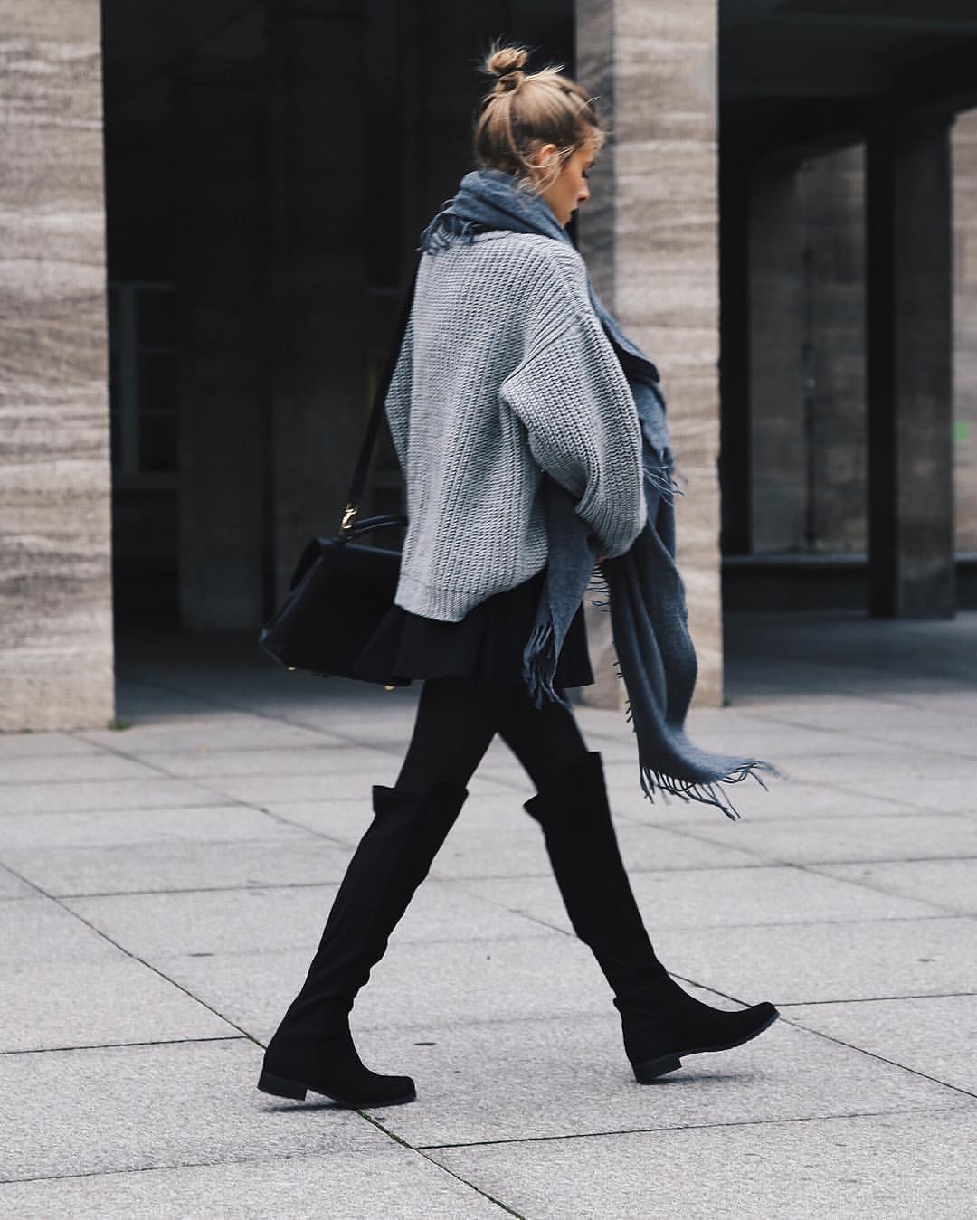 - Ylisuuri villapaita (tai pikemminkin villapaita), tiukat leggingsit, armeijan tyyliset kengät ja pakkauspussi.