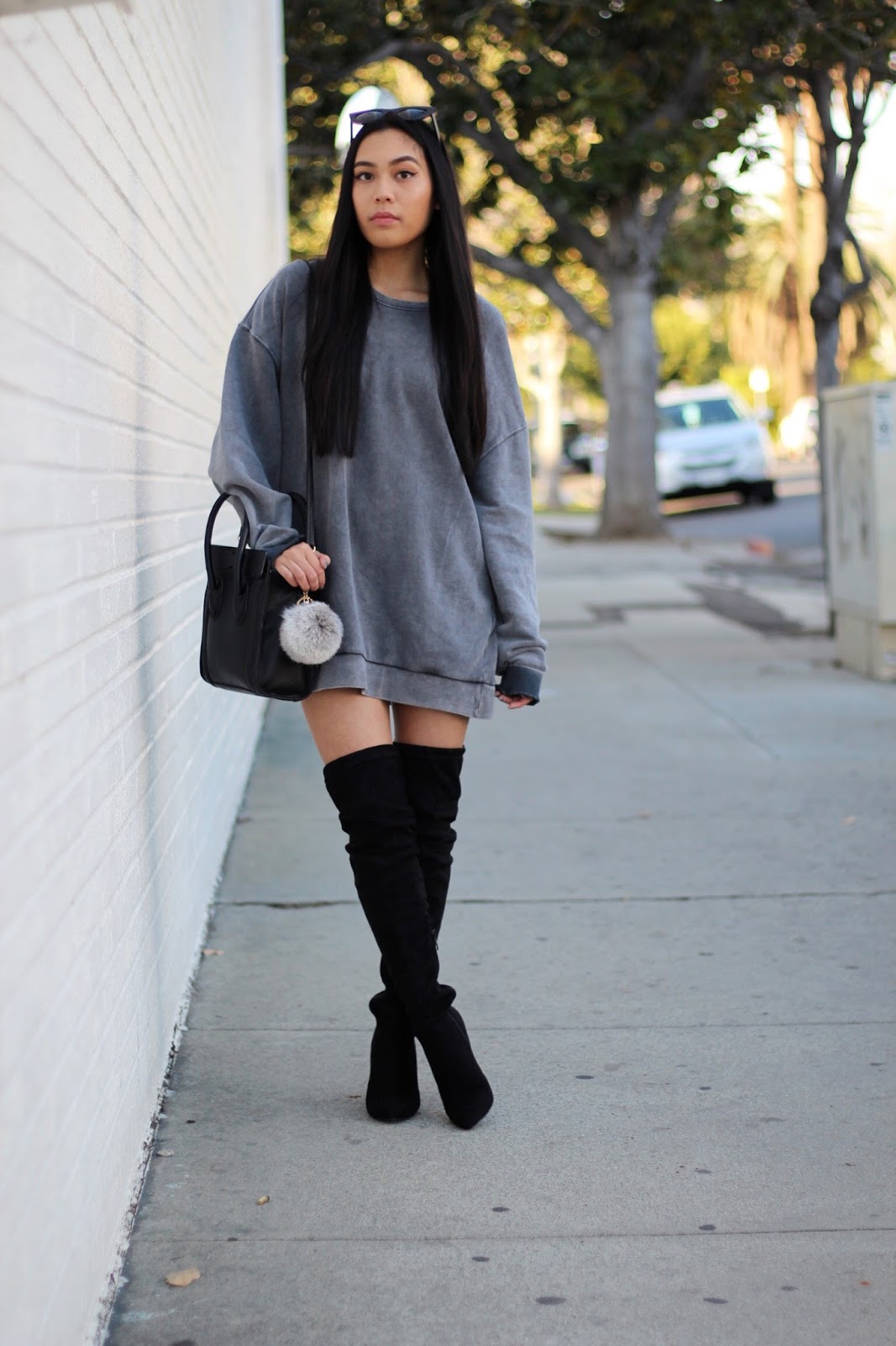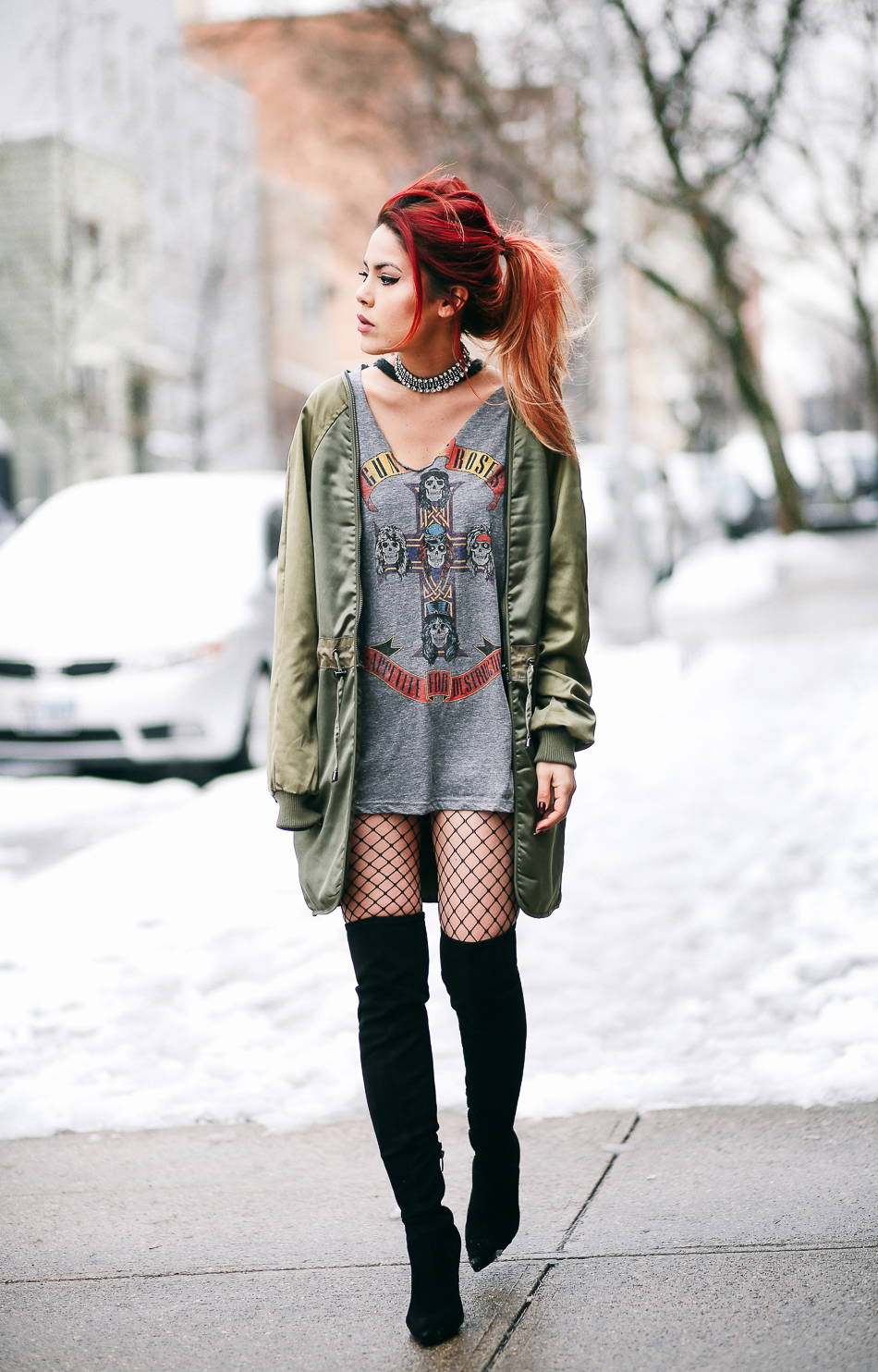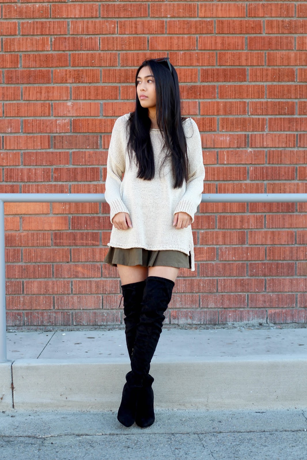 - Ylisuuri villapaita (tai pikemminkin villapaita), tiukat leggingsit, armeijan tyyliset kengät ja pakkauspussi.