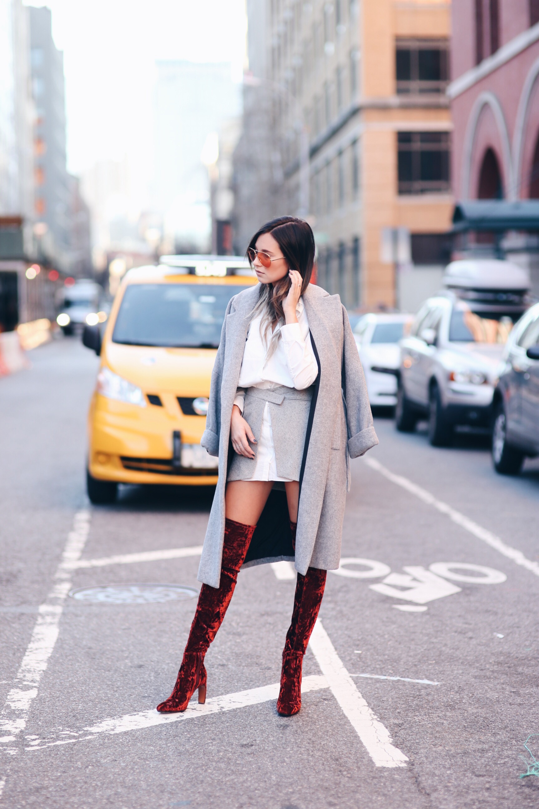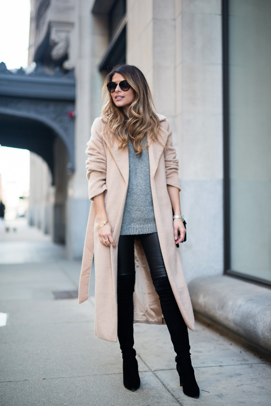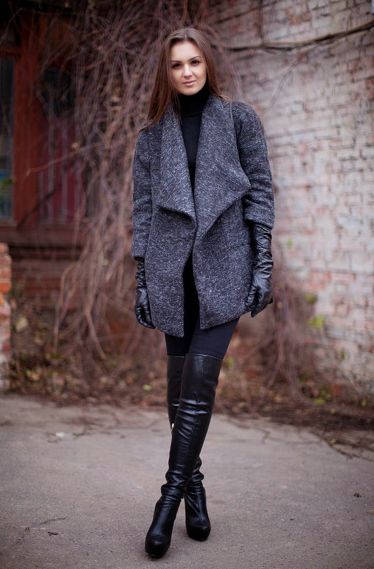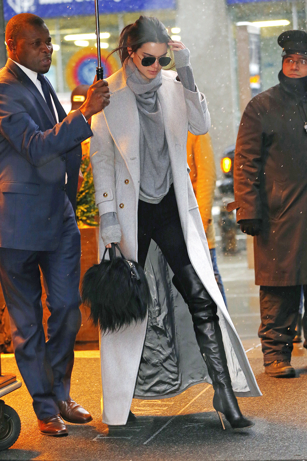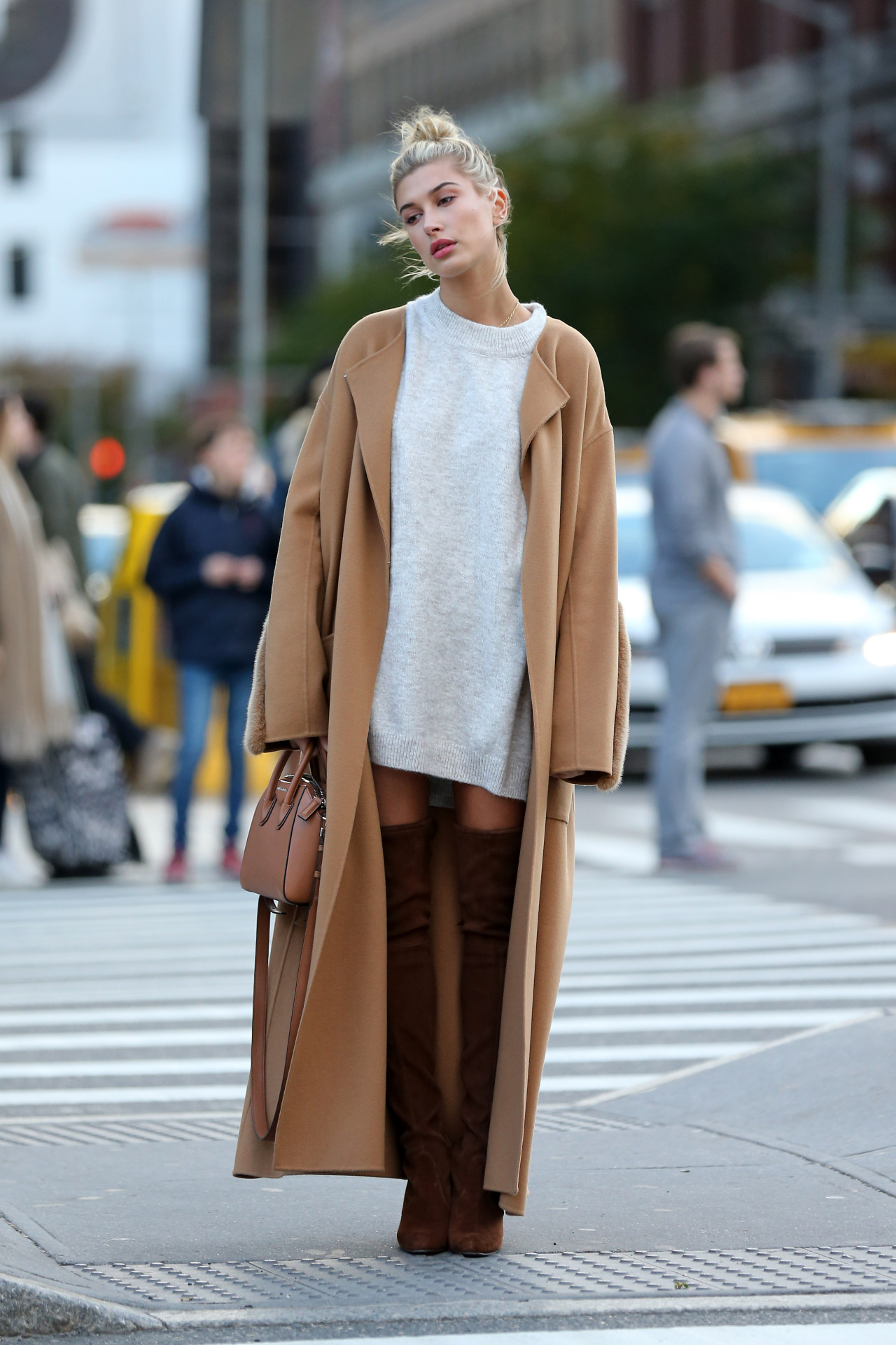 - Gigi Hadid ehdottaa, kuinka kasvaa visuaalisesti vieläkin pidemmäksi-me täydennämme kuvaa lyhyellä napillisella puolisuunnikalla, jossa on vyö, polvipituiset sukat, joissa on laaja kaulus ja lattiapituinen takki.