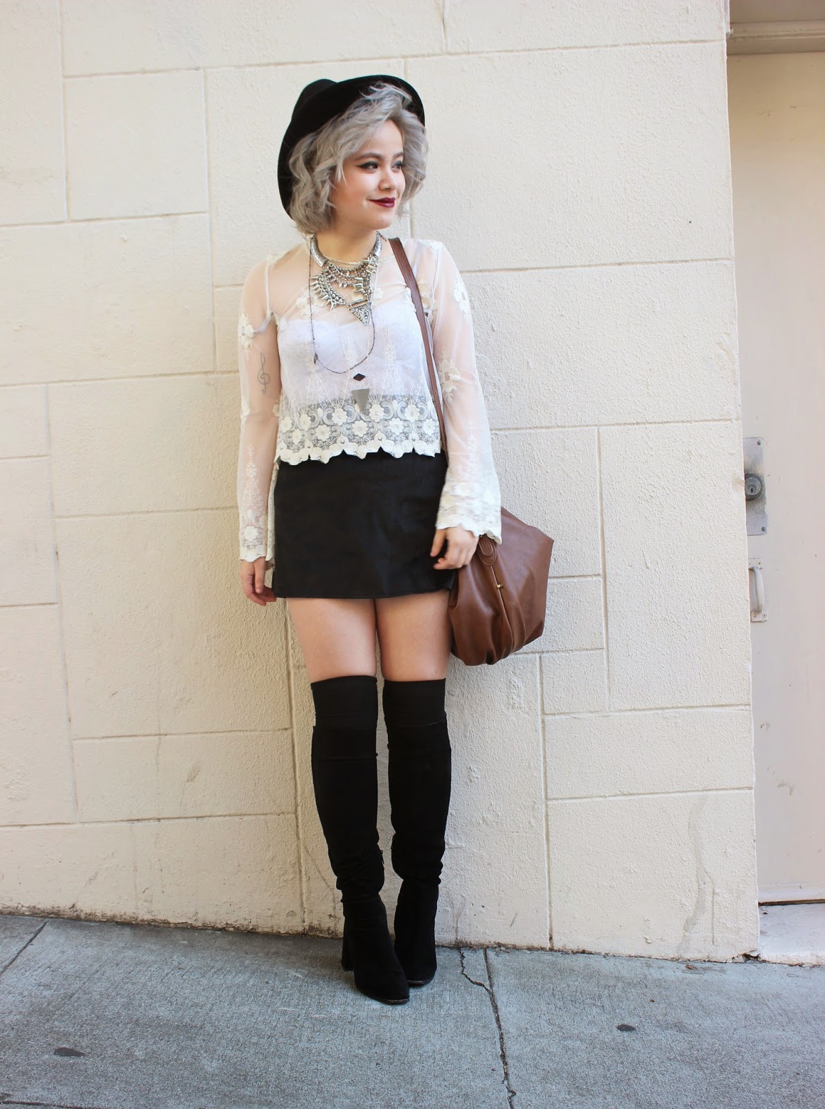 - Vasikanpituinen alusvaatetyylinen mekko, jossa on pitsiä koristeessa, sekä tilava vaaleanharmaa maxi-neuletakki vaaleanharmaalla. "Jalkineiden" tulisi olla matta kangasta, kuten velour.