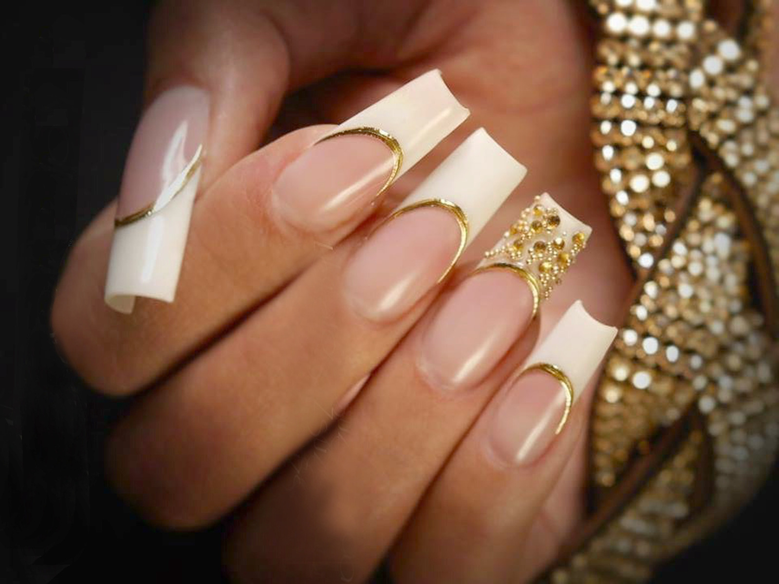 Kauden hitti on kultainen manikyyri. Mutta sitä ei tarvitse täydentää kokonaan määritetyllä värillä. Riittää, kun käytät kimalluksia, liemiä ja kiviä halutun kuninkaallisen tuloksen saamiseksi. Voit kiinnittää kiinnikkeet itse. Tämän seurauksena saat ainutlaatuisen suunnittelun. Tämän vaihtoehdon etuna on, että pienet jyvät voidaan liimata uudelleen, mutta uudessa paikassa. He eivät menetä kauneuttaan edes kymmenen kerran jälkeen.