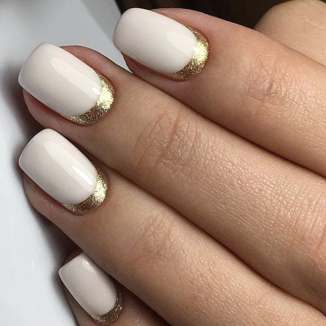 Ranska on suosittu ja ainutlaatuinen. Hän piti monista tytöistä. Voit monipuolistaa sitä mielenkiintoisten värien avulla, koska klassinen valkoinen ei aina herätä huomiota. Maalaa päät kultaisella geelilakalla ja päällystä pelkällä kestävyydellä. Tämä lisää ylellisyyttä ja rikkautta kuvaasi. Tässä tapauksessa levyn pääosa voidaan jättää värittömäksi tai maalata valkoisella ja millä tahansa alaston sävyllä.