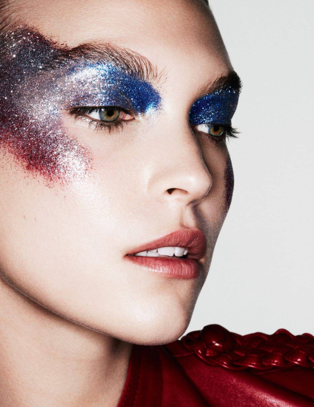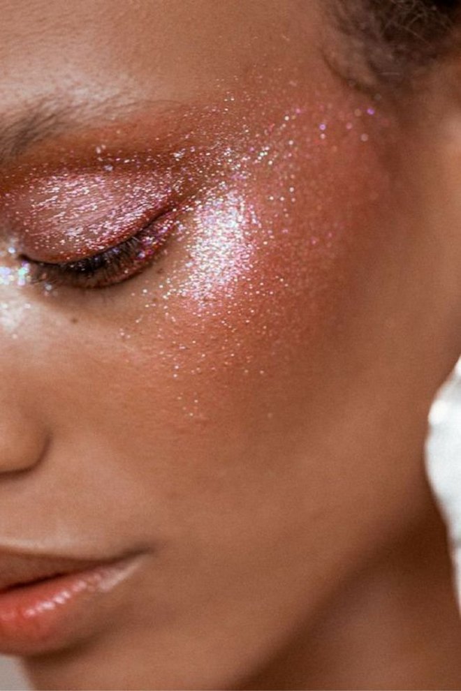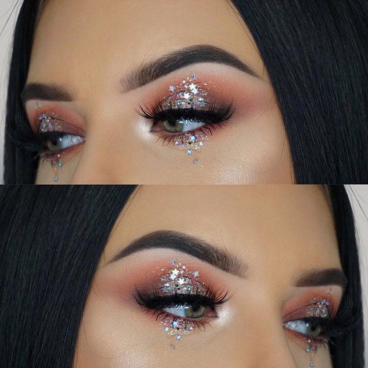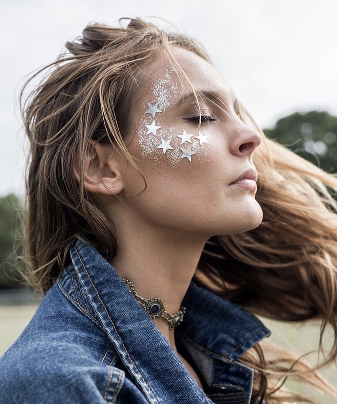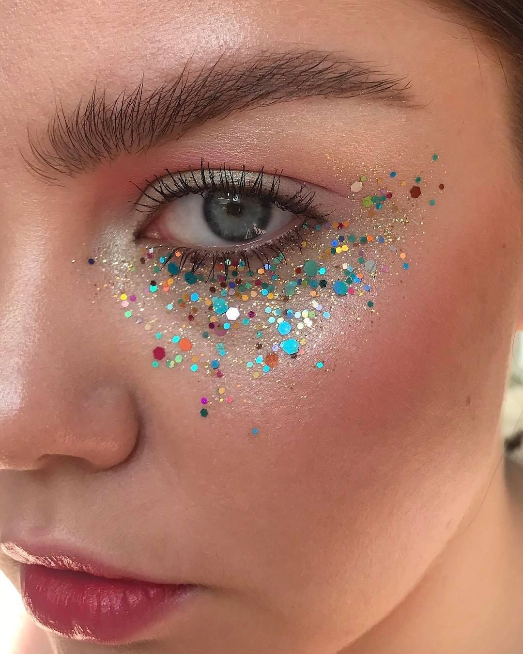 - Sur les pommettes et la peau. La poudre scintillante ou scintillante est doucement frottée sur le corps lors de la dernière étape du maquillage. De grosses paillettes ou encore des strass sont collés ponctuellement avec de la colle pour faux cils. Essayez de ne pas être trop zélé avec la quantité.