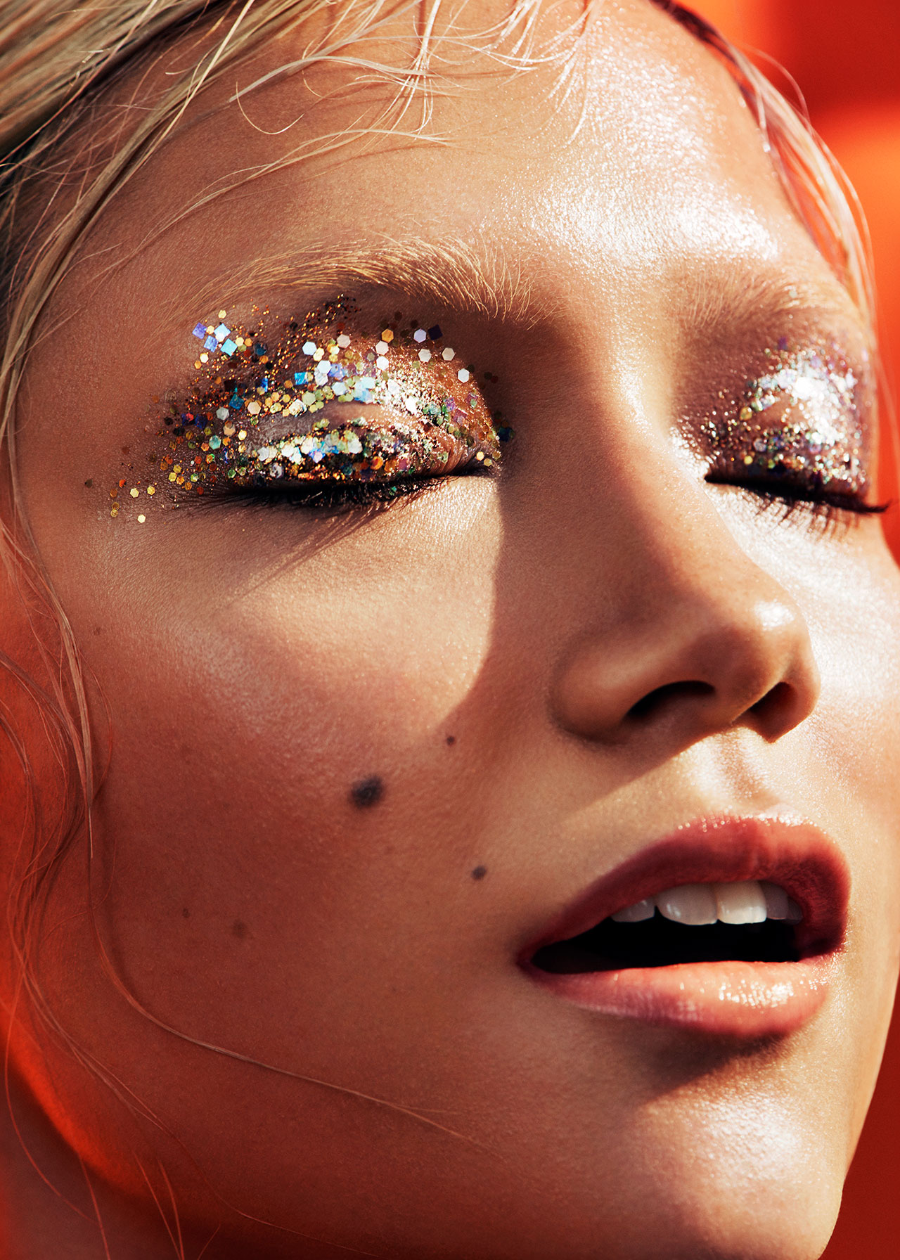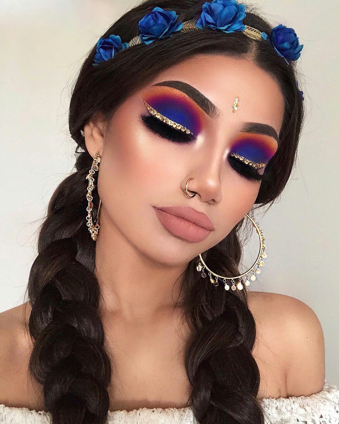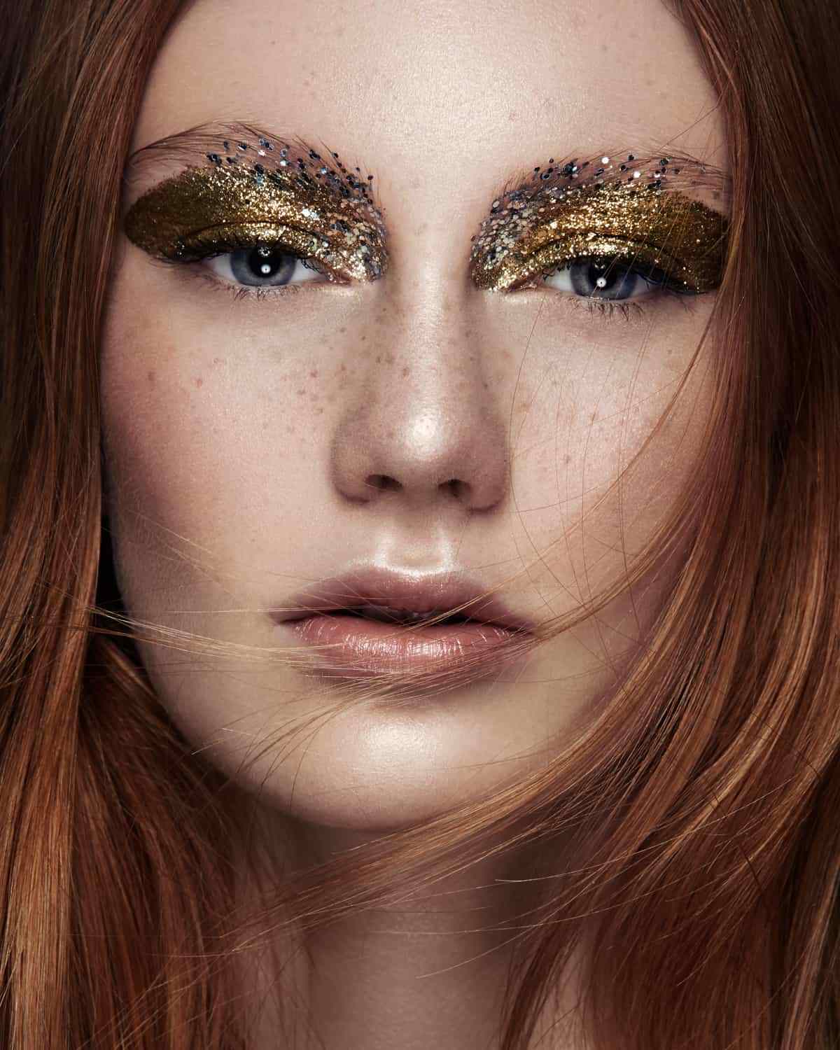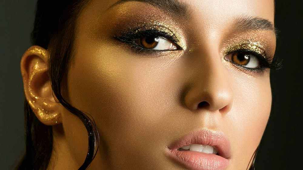 - Sur les pommettes et la peau. La poudre scintillante ou scintillante est doucement frottée sur le corps lors de la dernière étape du maquillage. De grosses paillettes ou encore des strass sont collés ponctuellement avec de la colle pour faux cils. Essayez de ne pas être trop zélé avec la quantité.