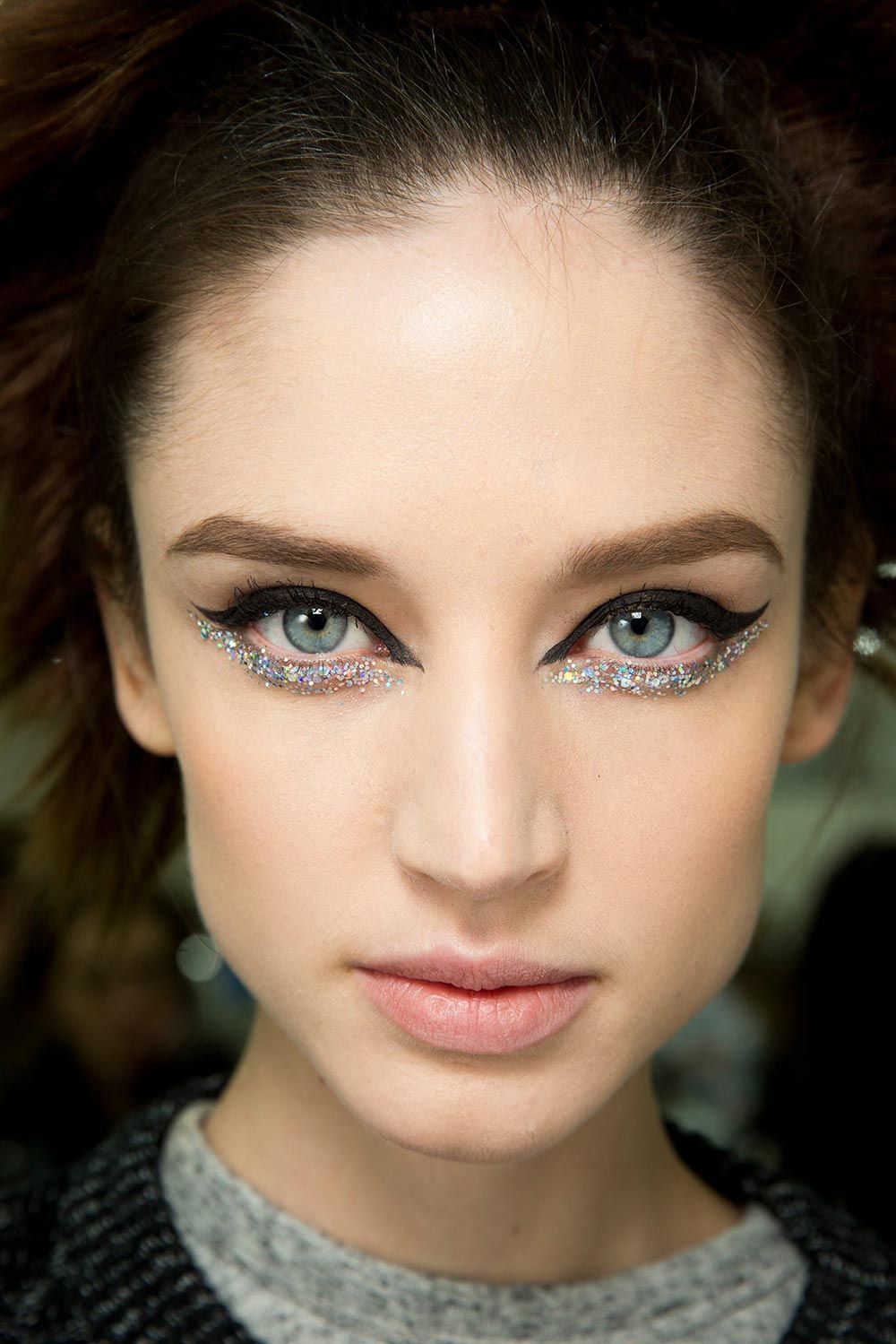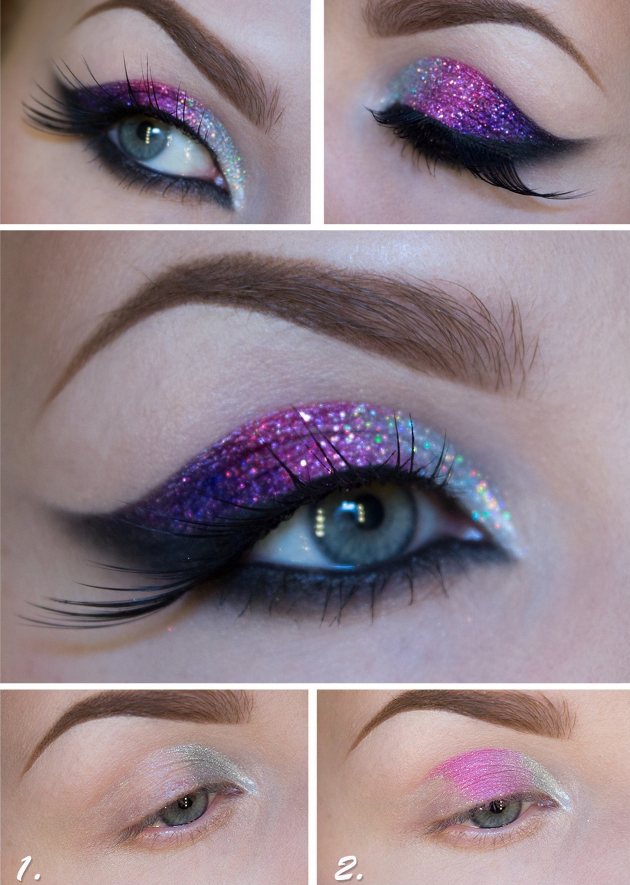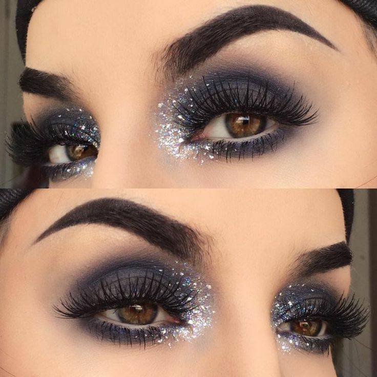 - Pour le réveillon, prenez un pigment bleu ou blanc. Peignez vos yeux très accrocheurs. Collez les faux cils. Appliquer quelques grosses particules sur les tempes et les pommettes. Étalez abondamment les paillettes sur toute la paupière mobile ;