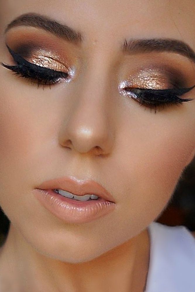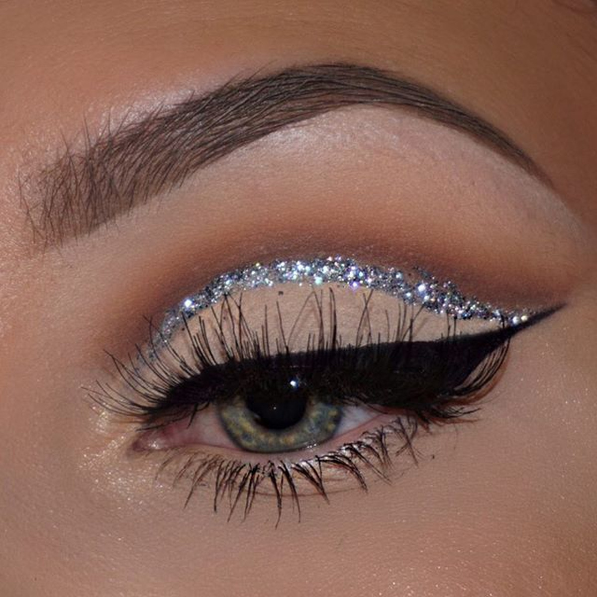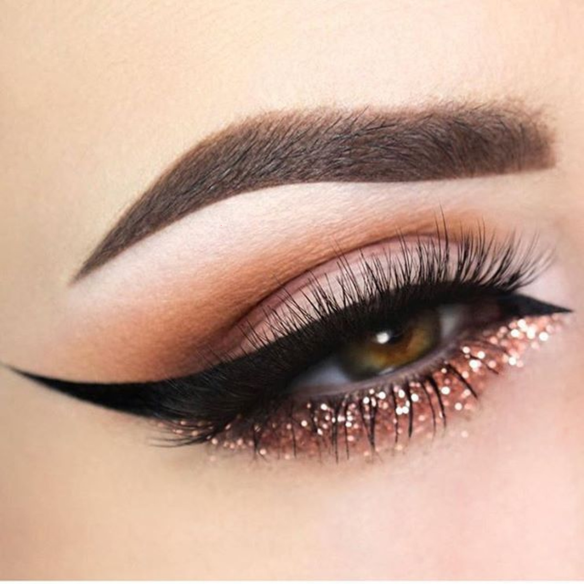 Maquillage de jour doit être doux, discret, neutre. La quantité minimale de substances scintillantes est placée à des endroits avantageux. La solution la plus cool sera des flèches étincelantes. Au-dessus de la ligne noire habituelle, une ligne avec des paillettes est soigneusement dessinée.
