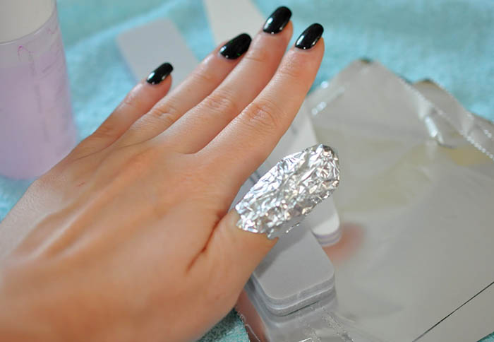 - Óvatosan húzza le a fedőlakk fedőrétegét. Erre azért van szükség, hogy a folyadék gyorsabban elérje "ellenségét". Azok, akik ezt a lépést figyelmen kívül hagyják, kétszer annyi ideig várnak a keverékkel való érintkezésre.