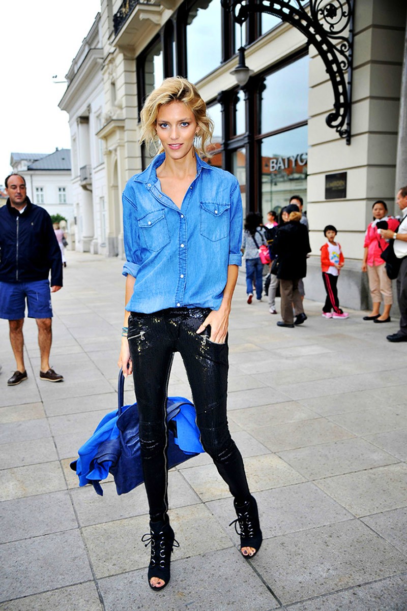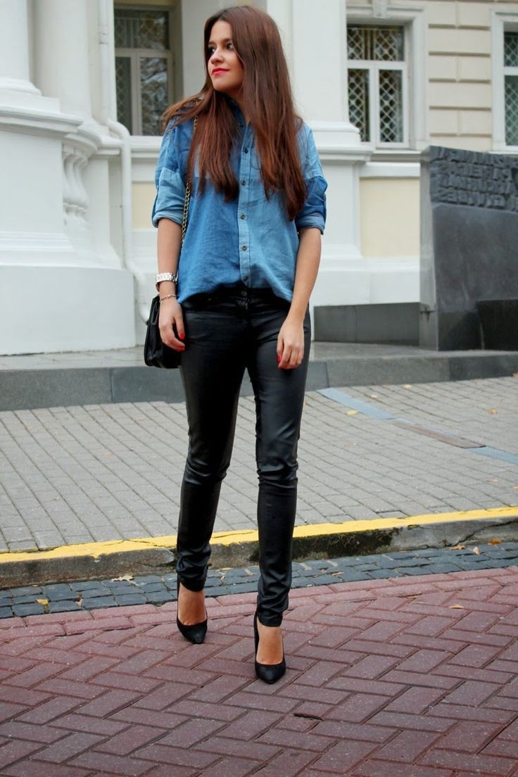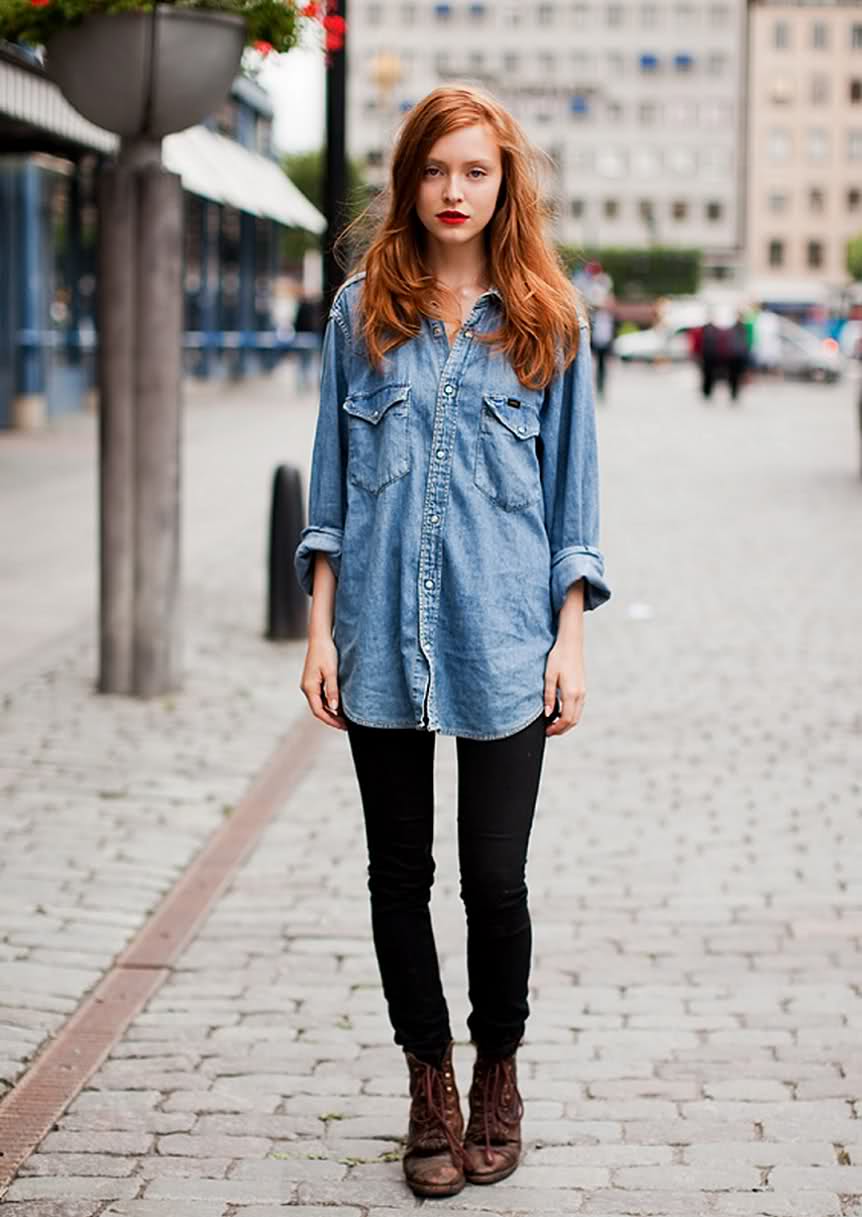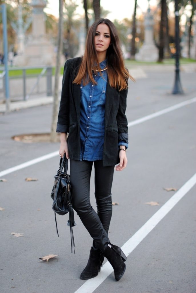 - kísérletezzen kontrasztos textúrákkal és hangokkal. Ha a farmer világos számukra, válasszon teltebb tónusú inget, amely nem díszített és nem fakul. Kombinálja a sötét monokróm bőröket világoskék felsővel;