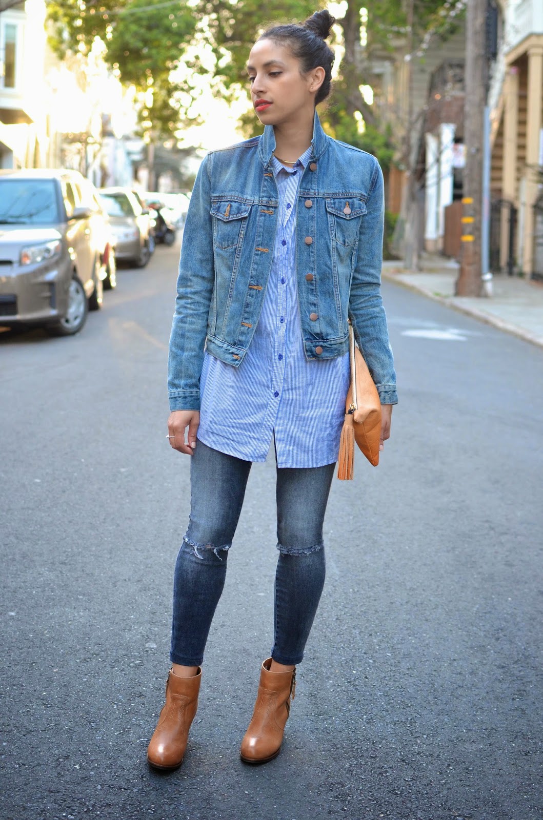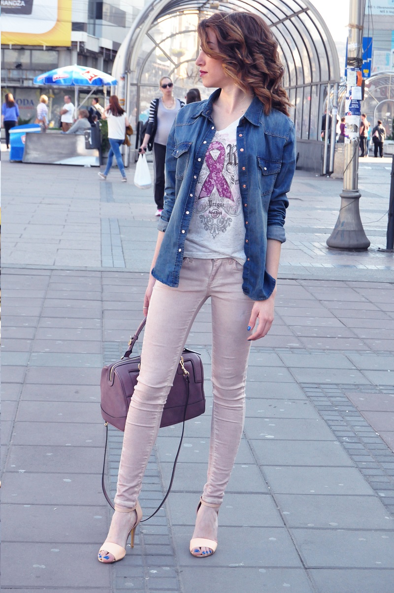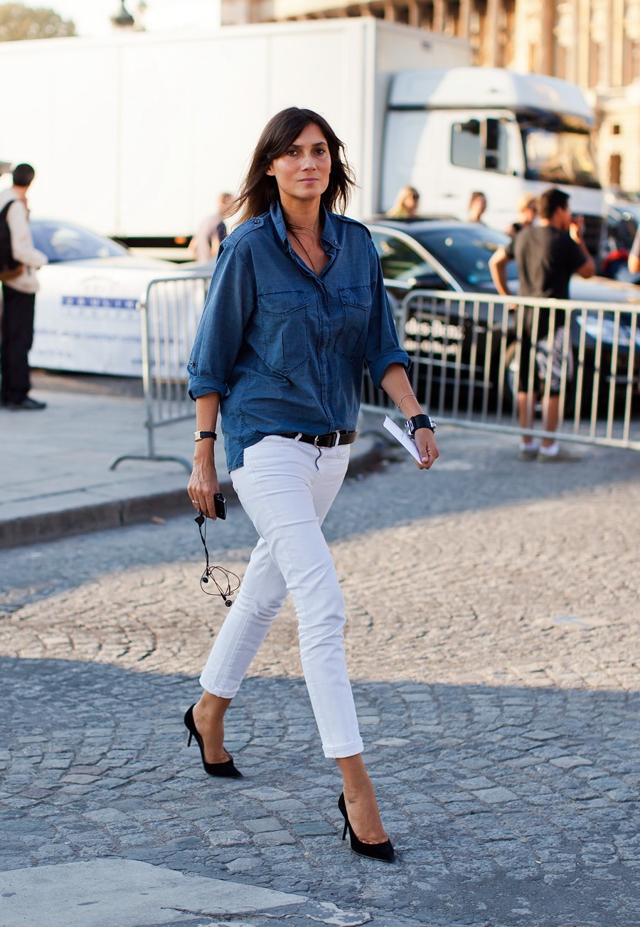 - kísérletezzen kontrasztos textúrákkal és hangokkal. Ha a farmer világos számukra, válasszon teltebb tónusú inget, amely nem díszített és nem fakul. Kombinálja a sötét monokróm bőröket világoskék felsővel;