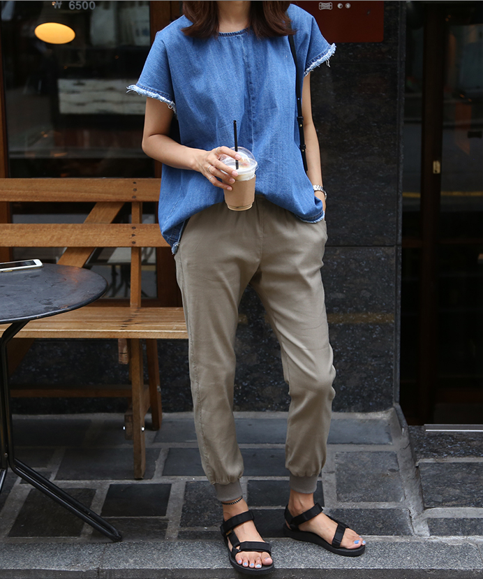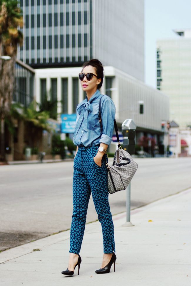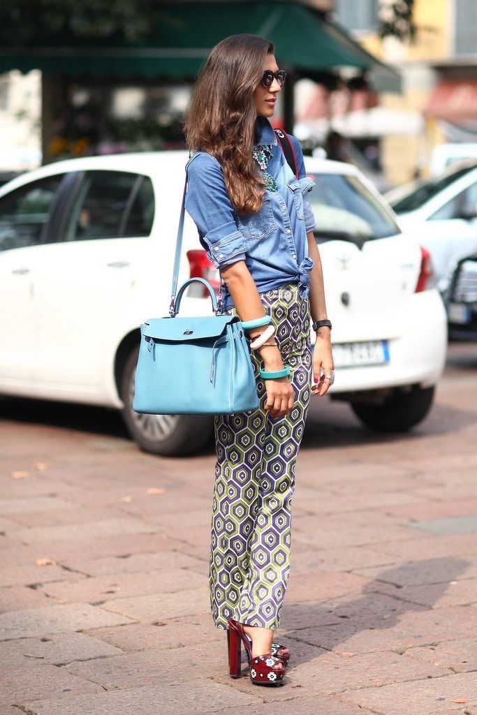 Nem rossz megoldás - a nadrágokkal ez a módszer lehetővé teszi a farmer cseréjét, különösen, ha nem széles. A nőiesebb megjelenés érdekében használjon finom ékszereket és magas sarkú cipőt. Virágos nadrág nyáron is viselhető, kivéve, ha a csípő nagy. Nagyon vonzó színkombináció lesz, amelyben az árnyalatok tartománya fokozatosan változik - a felső rész fényétől a lefelé sötétebb változatokig.