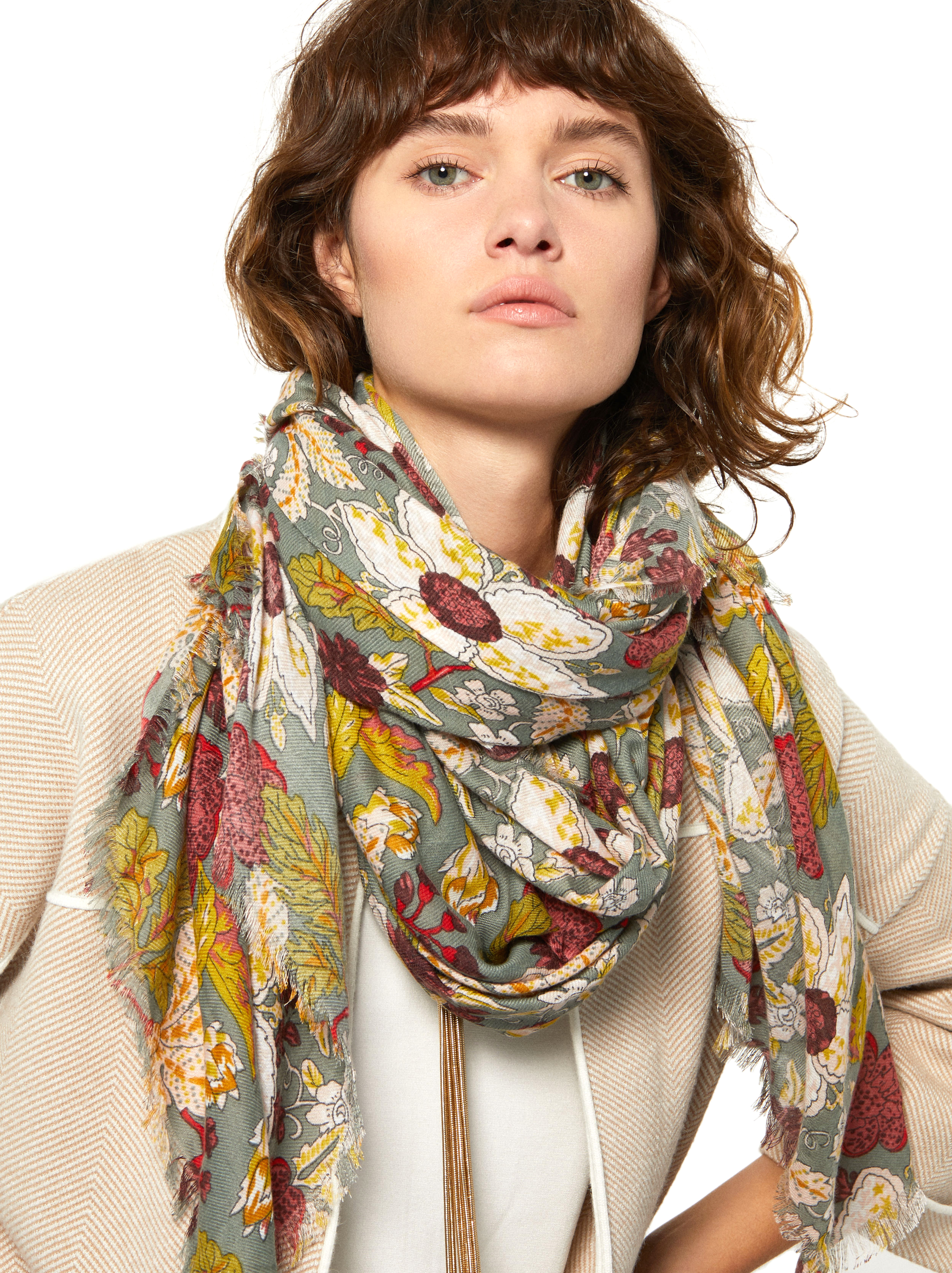 Il complète aussi bien un manteau discret, repose sur les épaules, couvre les cheveux. Il peut être noué avec une ceinture à la taille ou avec un turban. Une toile volumineuse transforme n'importe quelle image, ajoute une touche variée à une tenue stricte.