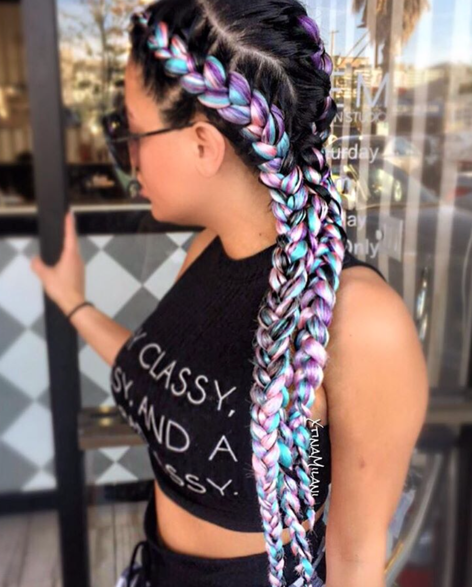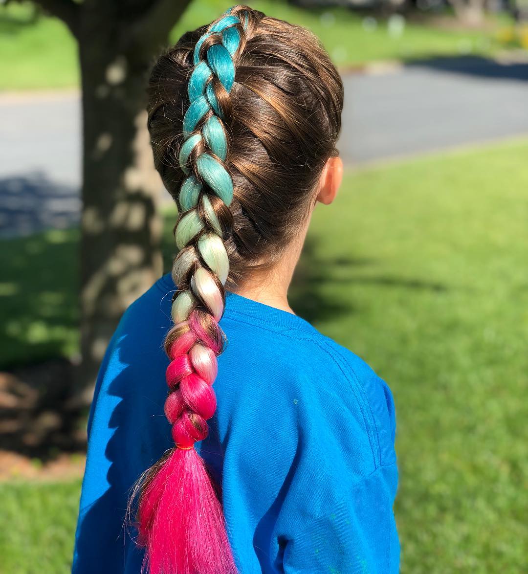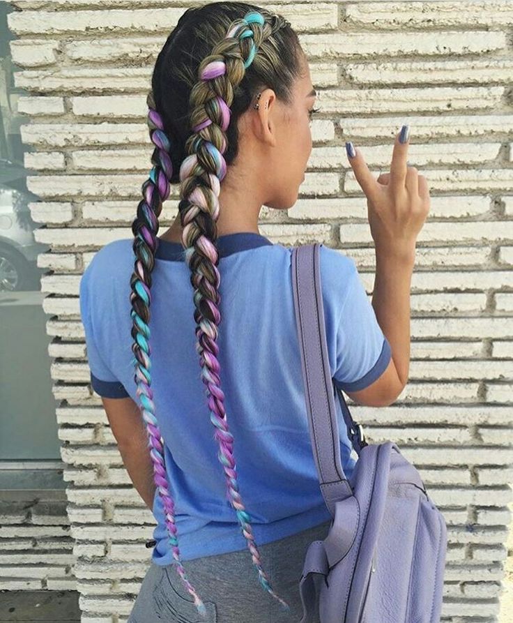 Un matériau de différentes couleurs est utilisé pour le tissage, ce qui rend la coiffure élégante, lumineuse et inhabituelle. Cette solution innovante met parfaitement l'accent sur l'individualité d'un jeune, son courage, son désir et, surtout, sa capacité à expérimenter. Même les très jeunes personnalités ont adopté la tendance fraîche, démontrant de volumineux nattes toutes les nuances de l'arc-en-ciel.