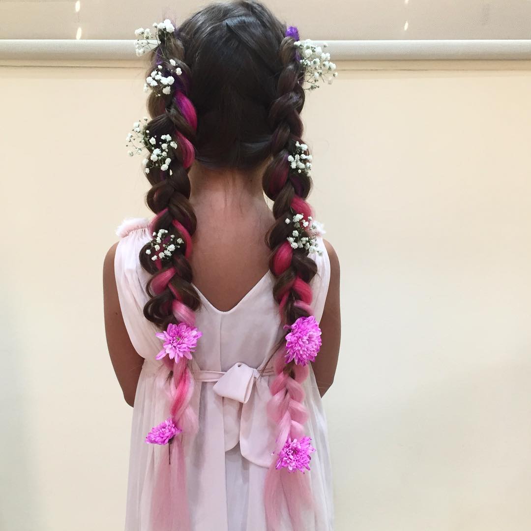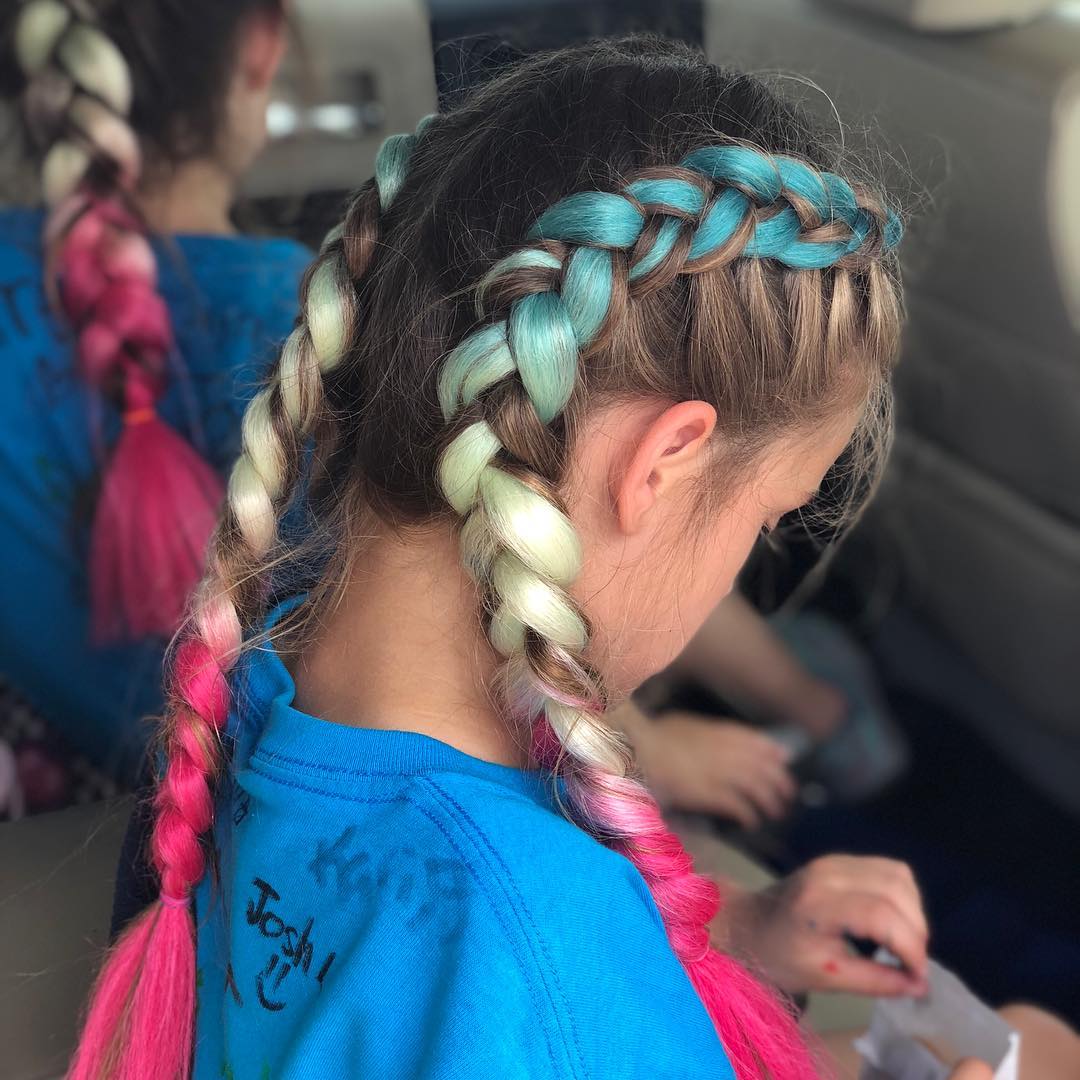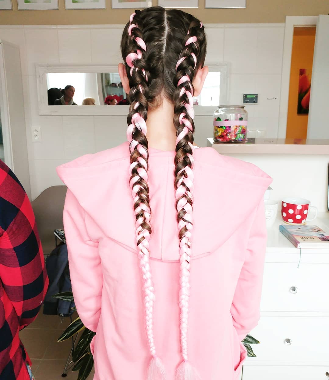 Un matériau de différentes couleurs est utilisé pour le tissage, ce qui rend la coiffure élégante, lumineuse et inhabituelle. Cette solution innovante met parfaitement l'accent sur l'individualité d'un jeune, son courage, son désir et, surtout, sa capacité à expérimenter. Même les très jeunes personnalités ont adopté la tendance fraîche, démontrant de volumineux nattes toutes les nuances de l'arc-en-ciel.
