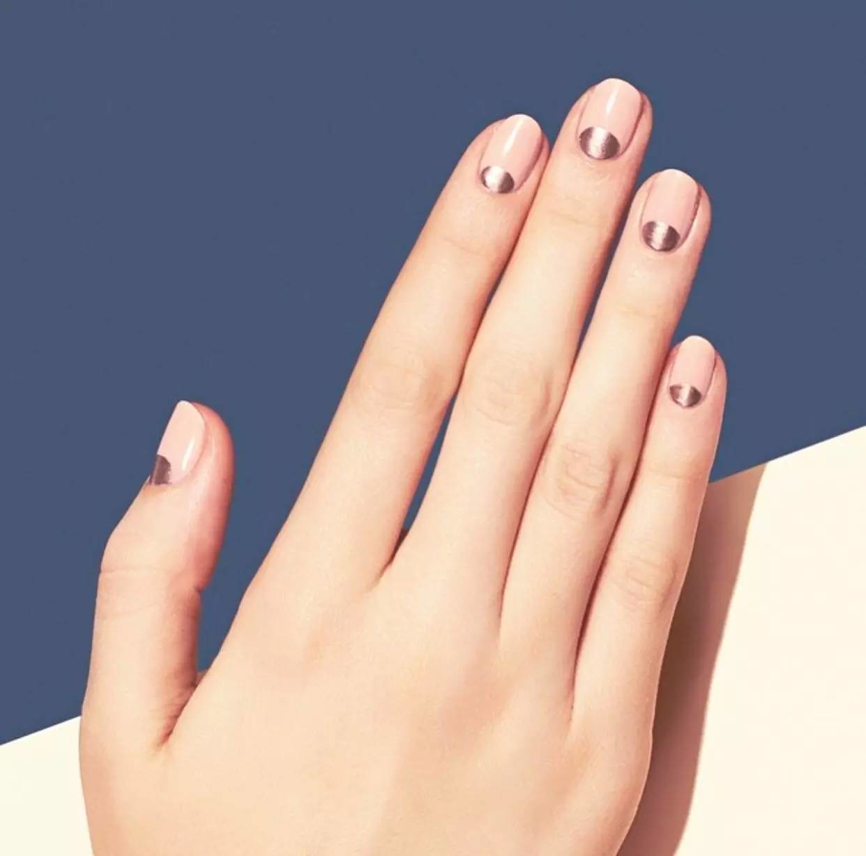 - Mais il existe un moyen beaucoup plus simple : vous recouvrez toute la surface de l'ongle avec un vernis destiné à la lunule, puis séparez la zone "demi-mois" avec un autocollant et peignez sur toute la partie supérieure avec un ton basique. C'est idéal pour les débutants, car votre seule tâche est de couper l'autocollant en une forme plate.