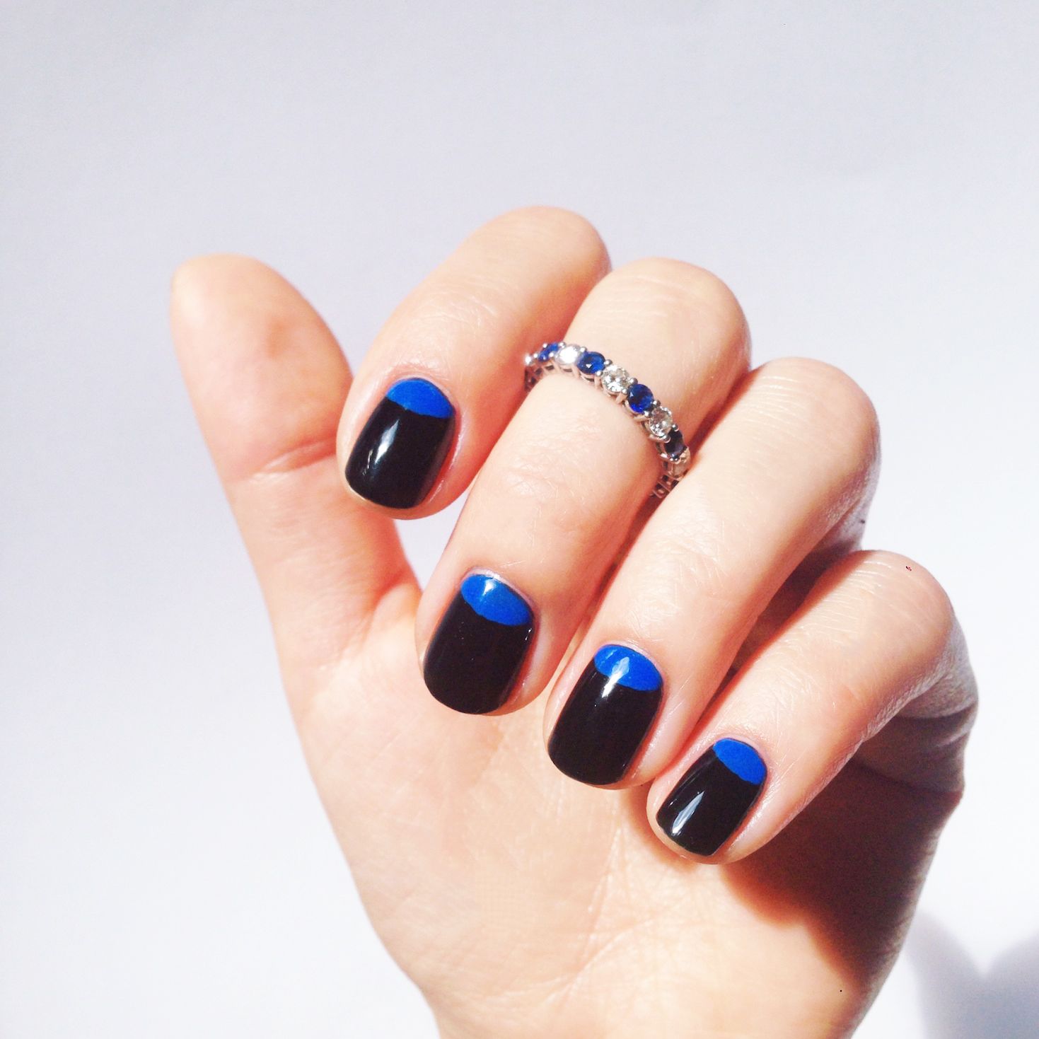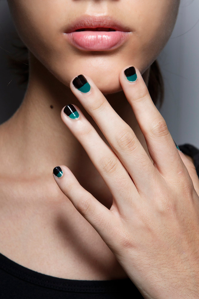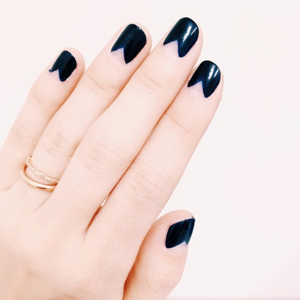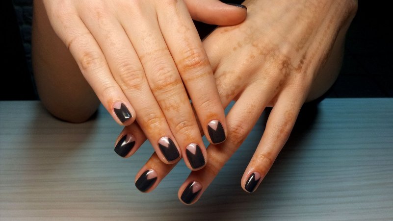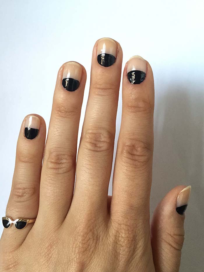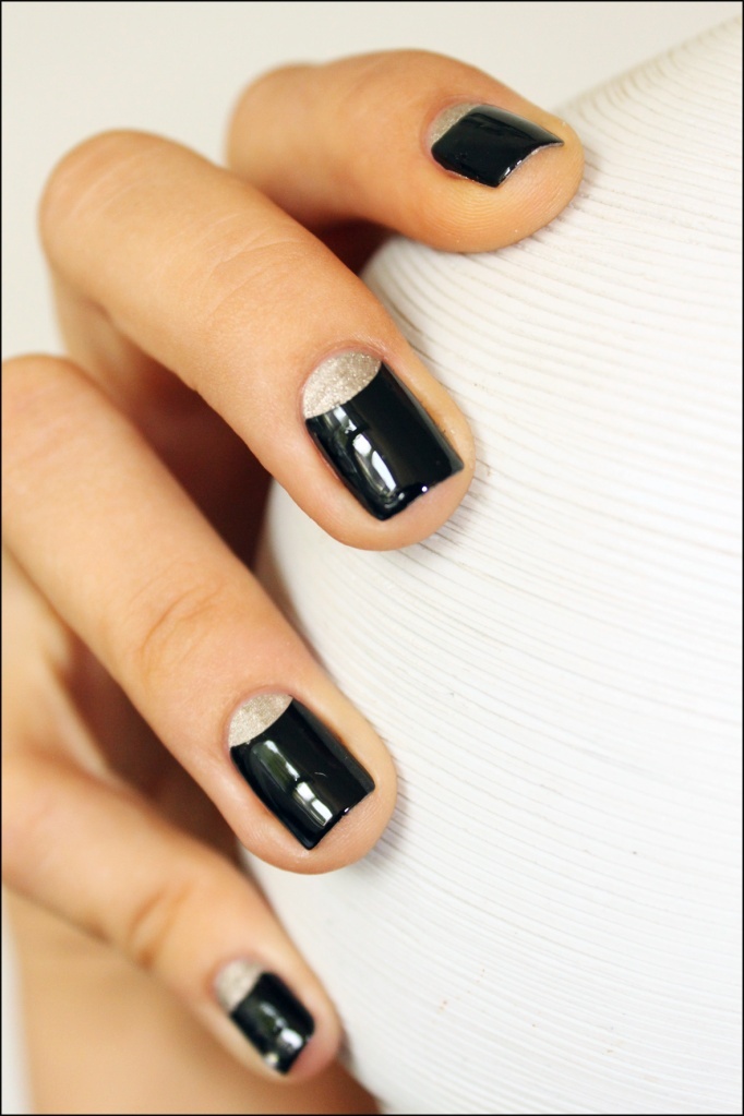 - Le vernis noir et blanc peut vous aider dans cette tâche difficile - l'invention d'une solution créative pour l'image. La base sera noire, qui recouvre tout l'ongle, en plus de la lunule. Comme un col sur une chemise, deux demi-cercles apparaissent sur tous les doigts avec un pinceau fin et de la peinture blanche. Vous pouvez mettre deux points au centre - et la vérité est que l'ongle vous rappellera immédiatement une jolie chemise ordinaire. Idée assez fraîche et non triviale, ayez le temps de l'utiliser.