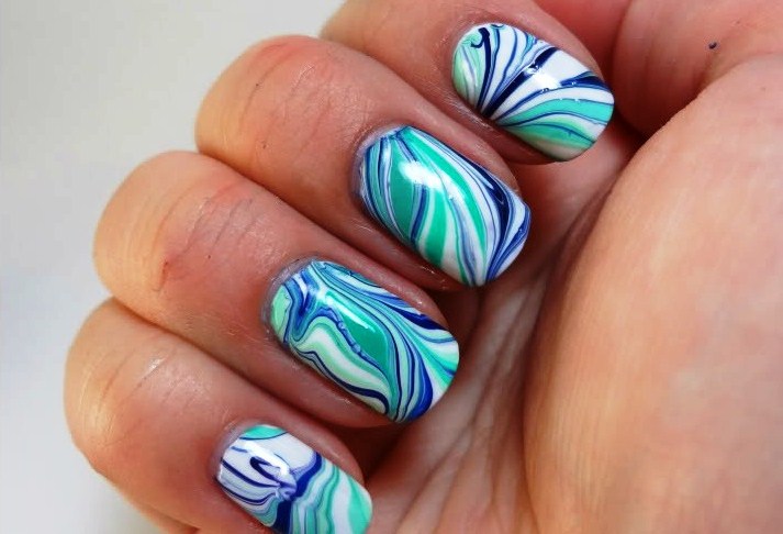 - L'eau consiste à mélanger deux ou plusieurs colorants dans un liquide propre. Ensuite, la phalange supérieure est immergée de sorte que le motif résultant repose parfaitement sur la surface. Haut avec haut.