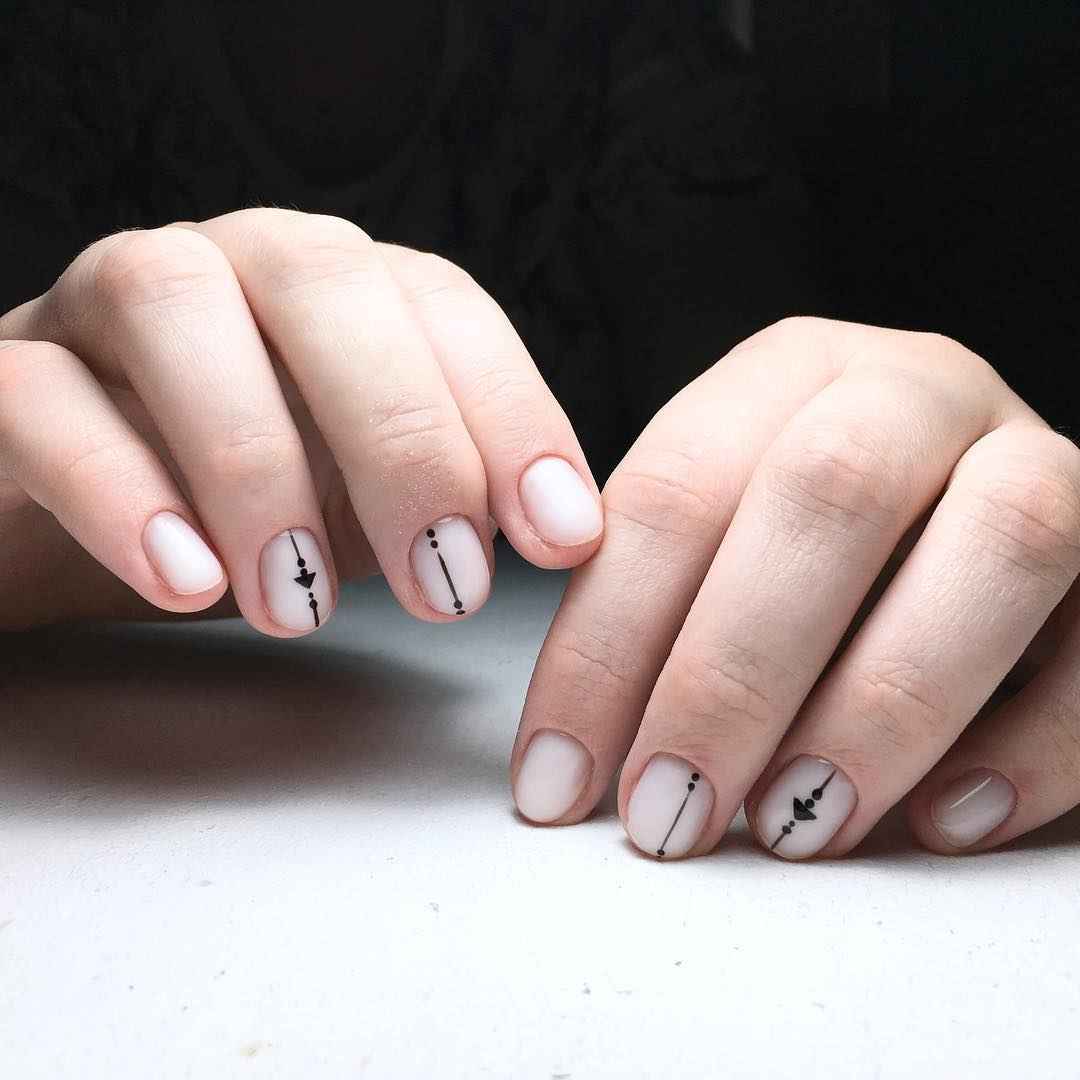 - Rayures C'est l'une des tendances les plus populaires de cette année. Les ongles sont recouverts d'une base translucide. Essayez la gomme laque dans les tons de peau clairs comme base. Après - appliquez de courtes bandes avec un pinceau fin ou un feutre.