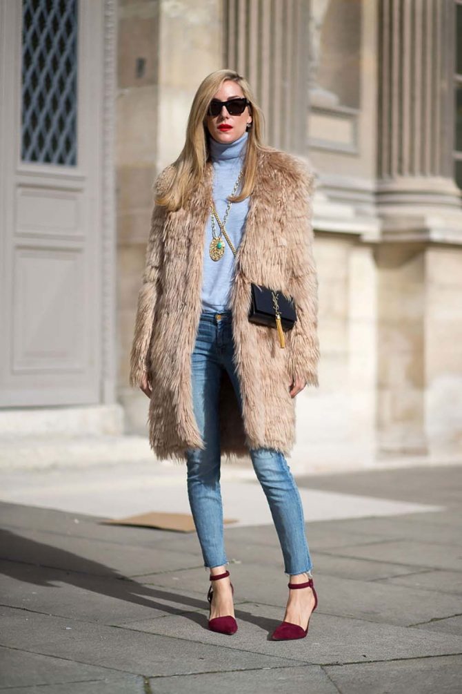 Un manteau en tweed ou en cachemire avec bordure en fourrure est le choix parfait pour un week-end ou une occasion spéciale. Choisissez une version monochromatique d'une nuance noble complexe : émeraude, bordeaux, ivoire.