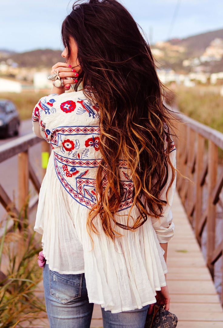 De kleurtechniek zelf gaat uit van een vloeiende, maar voldoende contrasterende overgang van donkere wortels naar lichte punten. Natuurlijk kun je een parallel trekken en vergelijkbare kenmerken zien in shatusha en balayage, maar het is in feite een afgeleide van de bovenstaande technieken. Hier hebben we het over een dieper en helderder effect van door de zon verbrand haar, wat niet kan worden bereikt met de bovenstaande methoden.