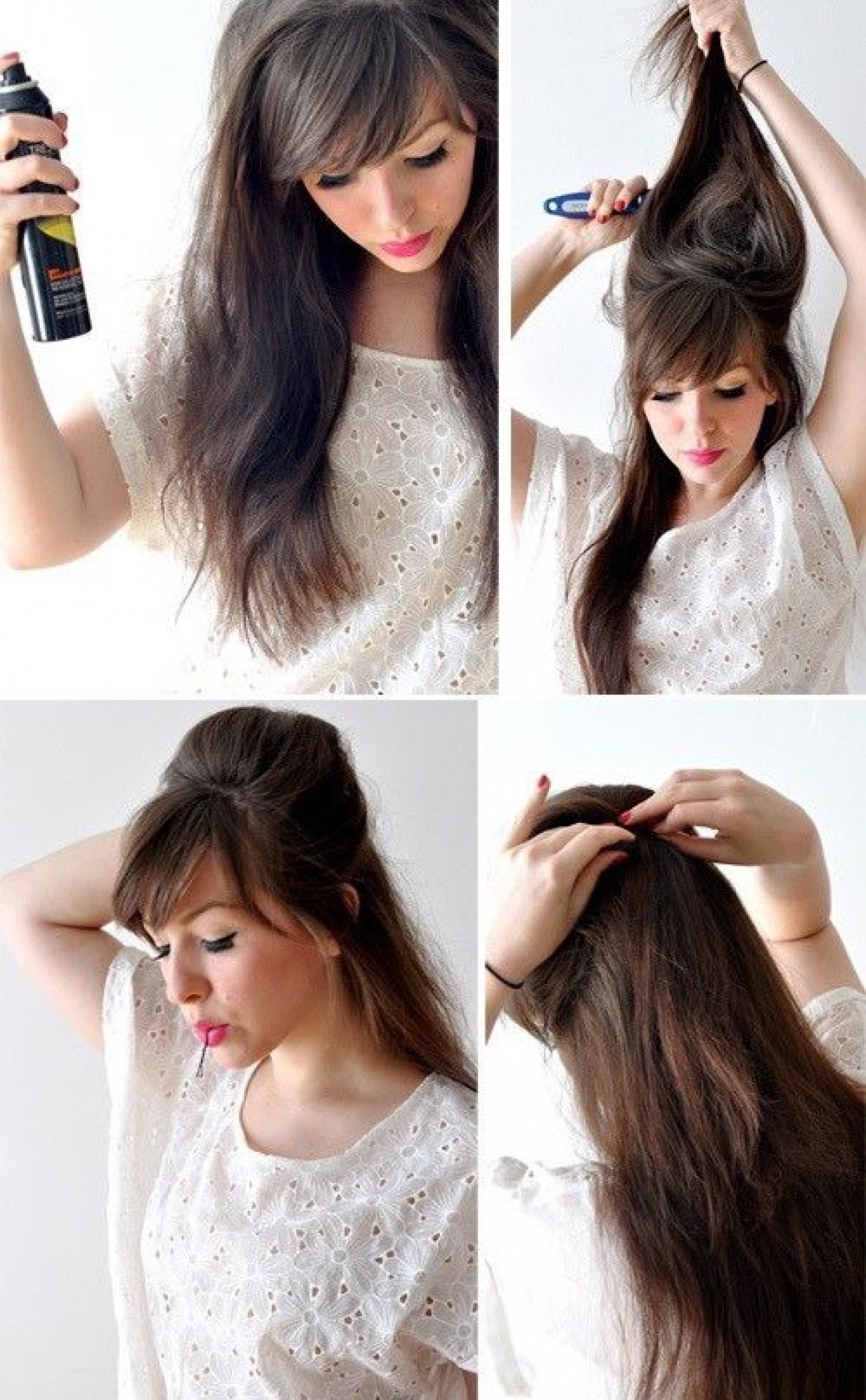 Proces tworzenia nie różni się od poprzednich instrukcji. Staraj się oddzielać grzywkę. Rozczesz, połóż na jednej stronie i posyp lakierem.