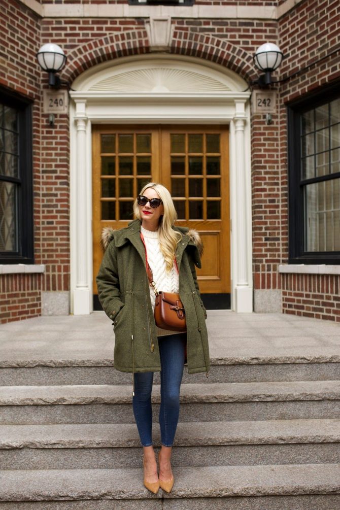 Grafitowe dżinsy dobrze prezentują się z zieloną parką. Jest to idealne rozwiązanie do tworzenia codziennego stroju. Jednocześnie nie jest pozbawiona wyrafinowania elegancji, którą podkreśla wybór czerwonej torebki i tego samego dzianinowego szalika. Dla kontrastu możesz nosić rękawiczki i czapkę w kolorze jasnoszarym lub białym.