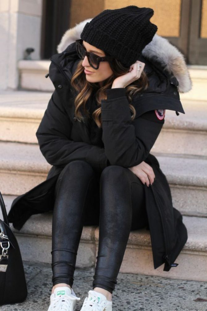 Klasyczna czarna kombinacja pomoże stworzyć surowy i elegancki styl. Takie tekstylia są połączone z lekkim futrem. Uzupełniają go botki na cienkim obcasie i obcisłe rajstopy. Obraz można uzupełnić mleczną lub białą sukienką z dzianiny.