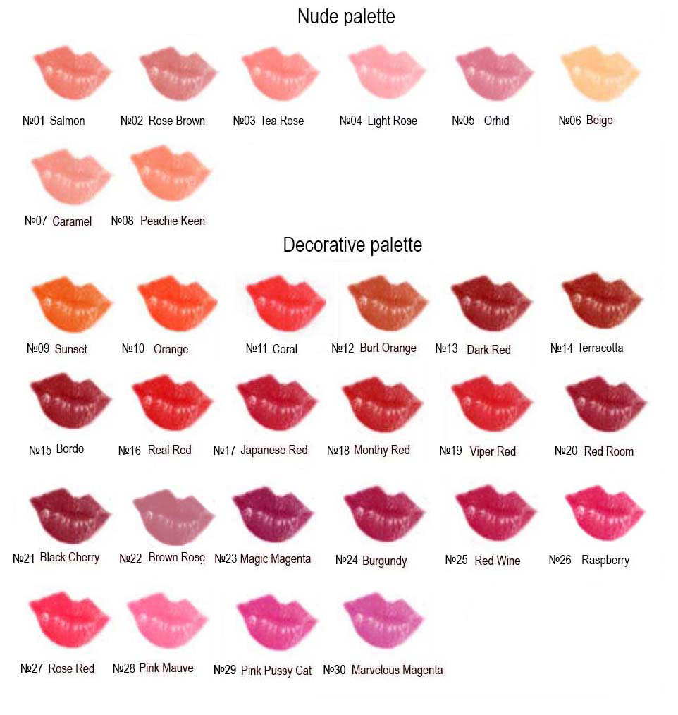 Adendo!A gama de cores disponível é muito ampla - desde notas delicadas e translúcidas, que proporcionam um brilho sutil, até acordes ricos que imitam um batom de longa duração. Existem até pigmentos que lembram glitter aplicado.