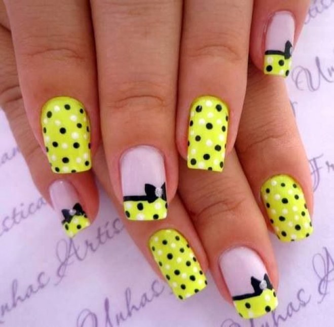 - Com a ajuda de algumas técnicas simples, você pode fazer muito Nail art engraçada e ligeiramente desleixada. Por exemplo, basta decorar as unhas com bolinhas pretas ou imitar o “traje” de uma abelha trabalhadora.