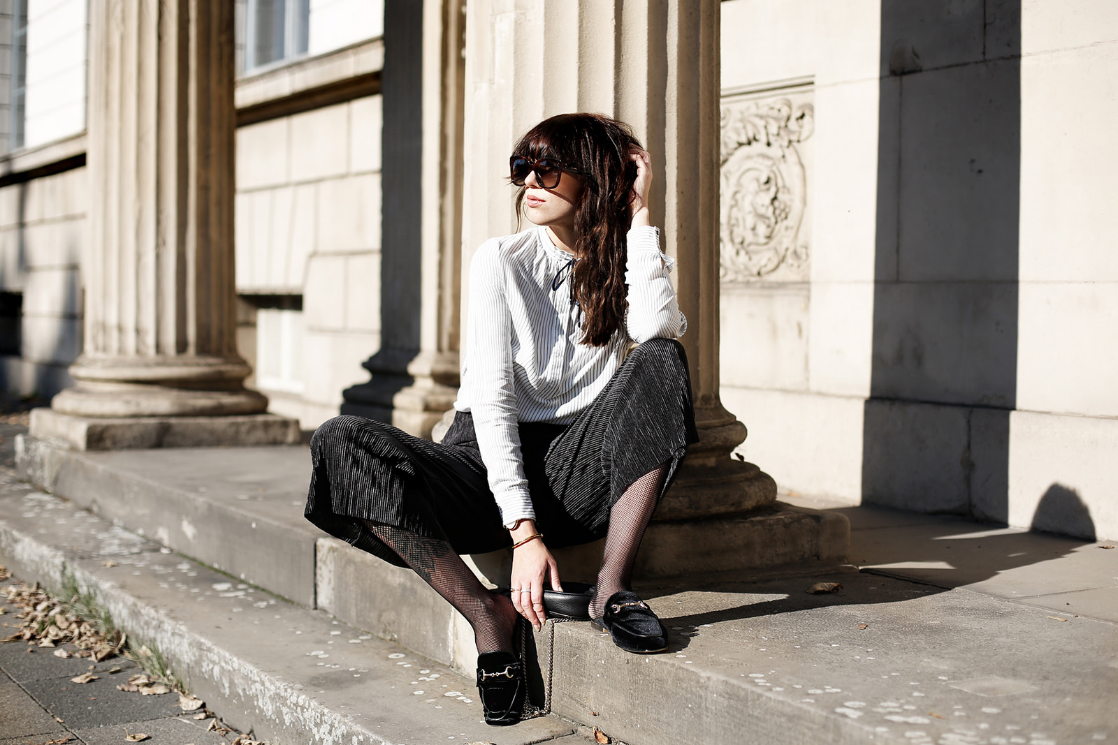 Dacă șefii de la munca dvs. sunt loiali experimentelor la modă, nu pierdeți ocazia de a forma un arc de lucru spectaculos și incredibil de confortabil cu rochie plisată chiar sub genunchi și catârii plate. Completează aspectul unei bluze supradimensionate.