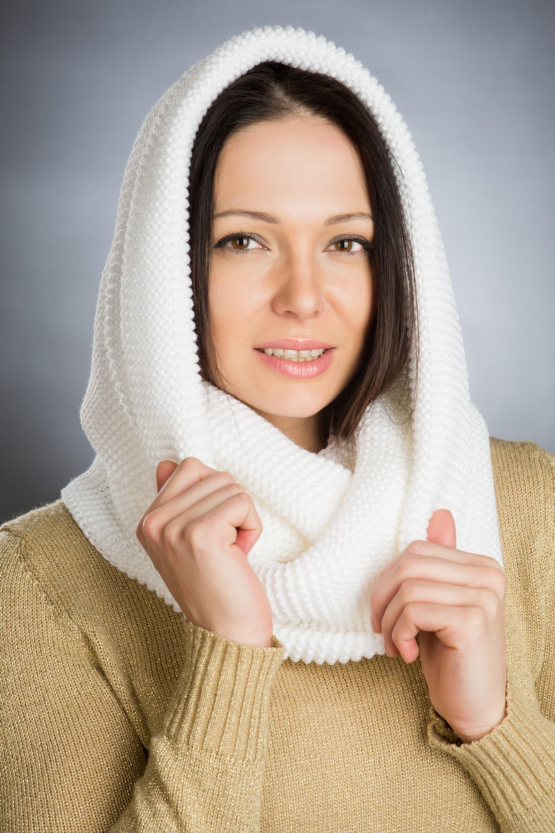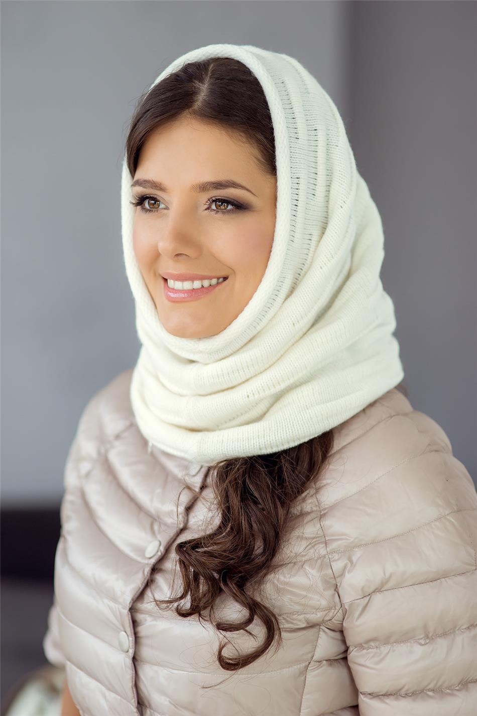 Sfat! DO glugă albă dintr-o țeavă prea lungă, înfășoară-o în jurul capului și așează restul pe piept. Marginile libere vor atârna frumos și vă vor oferi un plus de căldură.