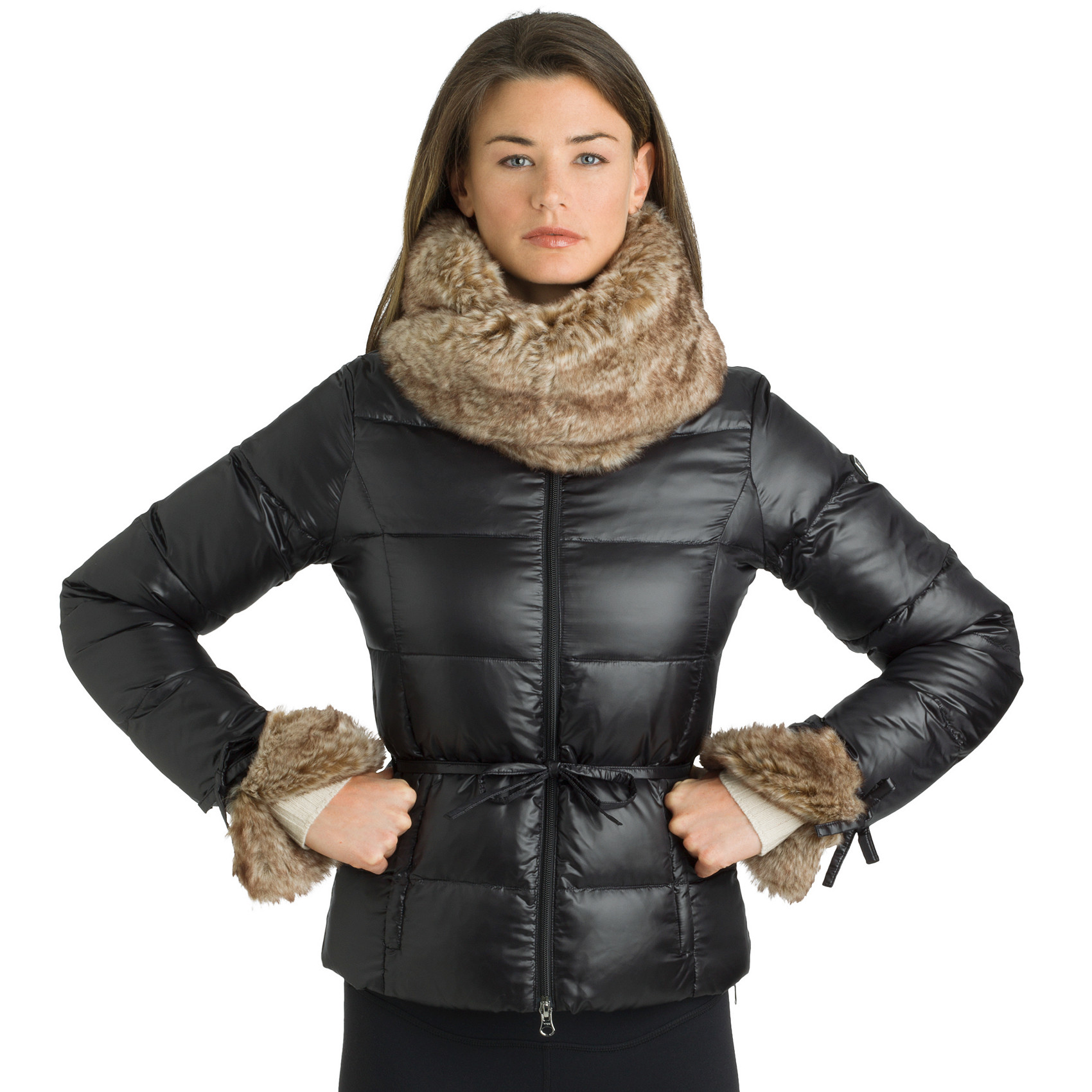 Jachetele largi care nu restricționează mișcarea și sunt concepute pentru antrenament fizic greu în aer liber se referă și la dorința proprietarilor de a-și decora gâtul cu o eșarfă rotundă elegantă. Doar aici ar trebui să acordați preferință opțiunilor cu ornamente strălucitoare.