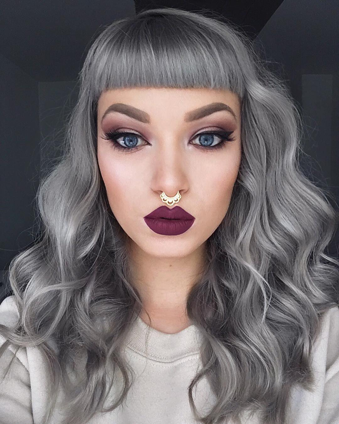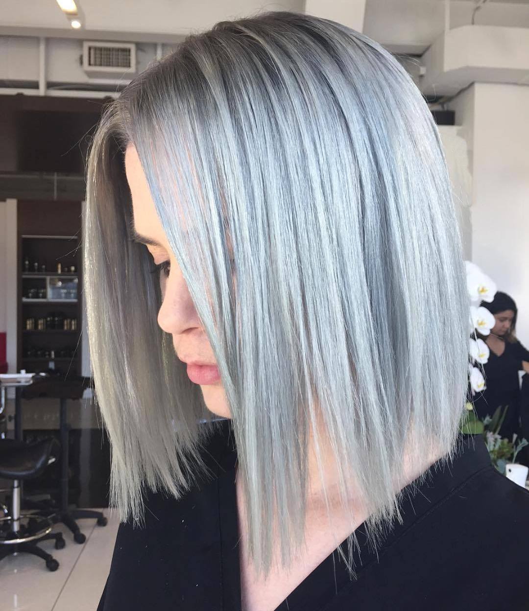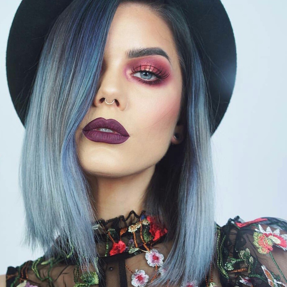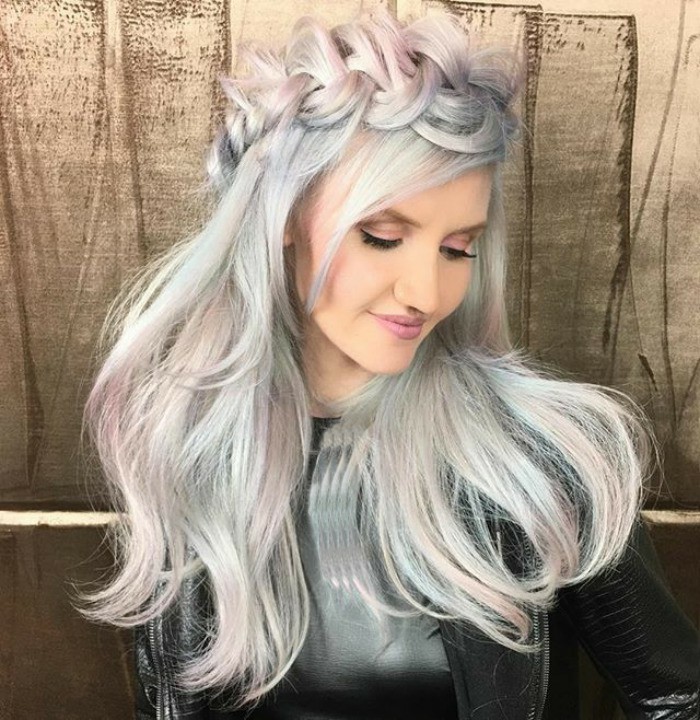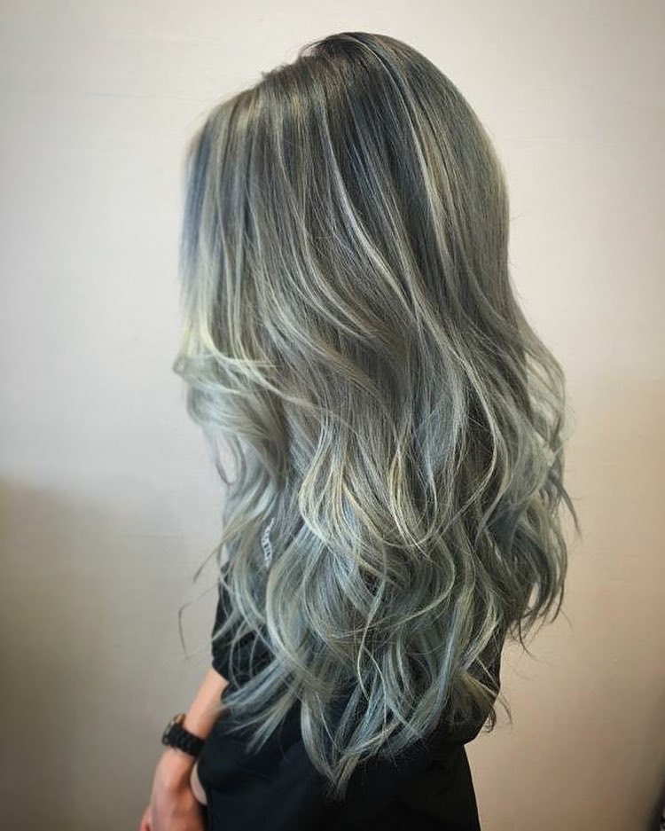 - Gris-bleu la palette est obtenue en ajoutant un mixton bleu au colorant.Pour cette raison, les brins auront un fond blanc avec une nuance bleuâtre. Seules les beautés les plus audacieuses, s'efforçant de paraître aussi inhabituelles que possible, décident de telles expériences.