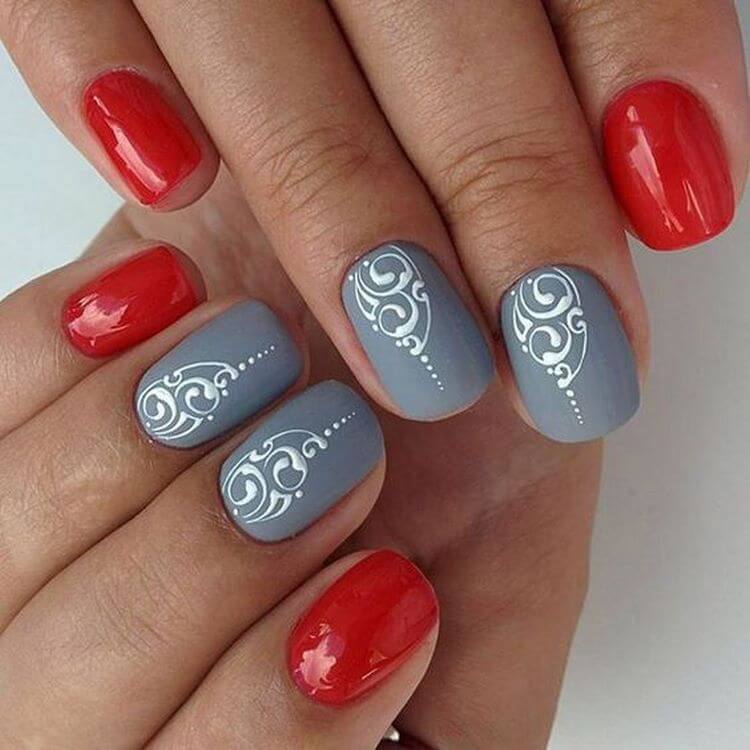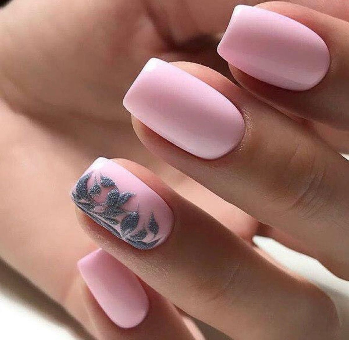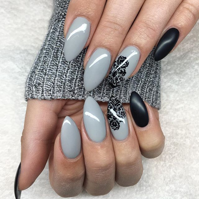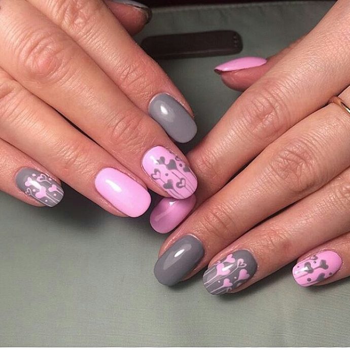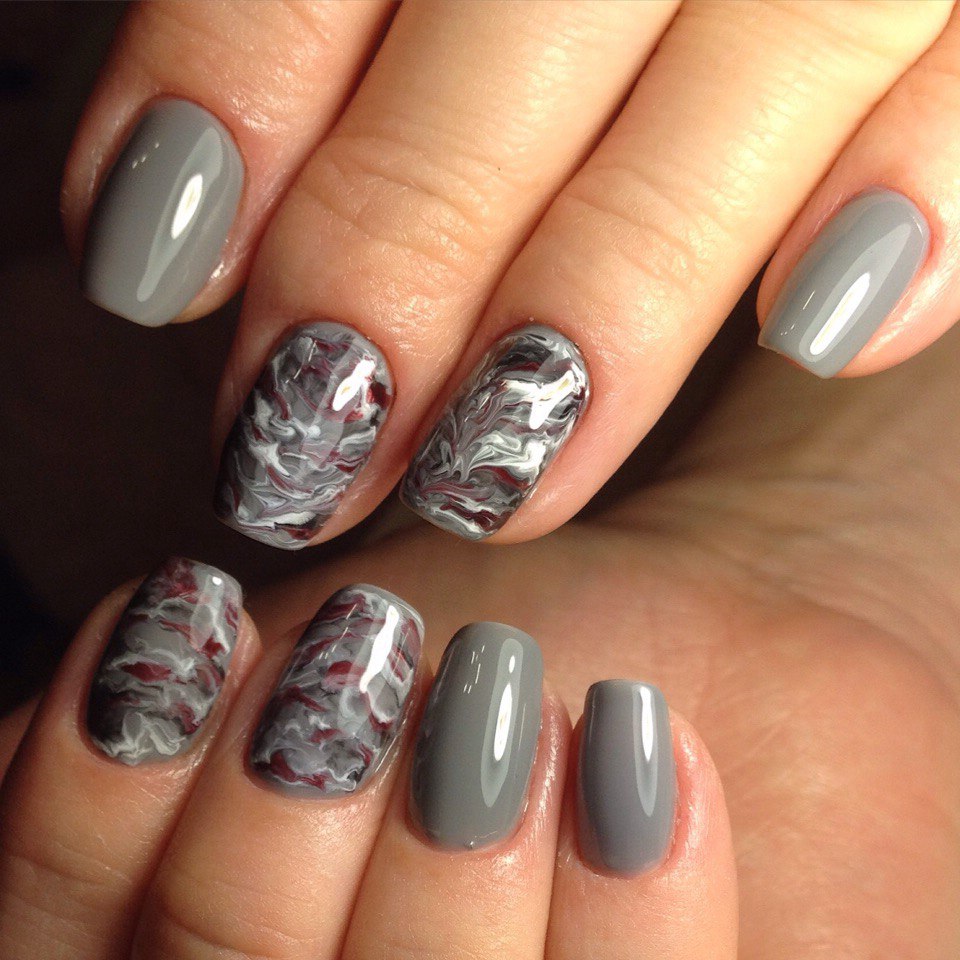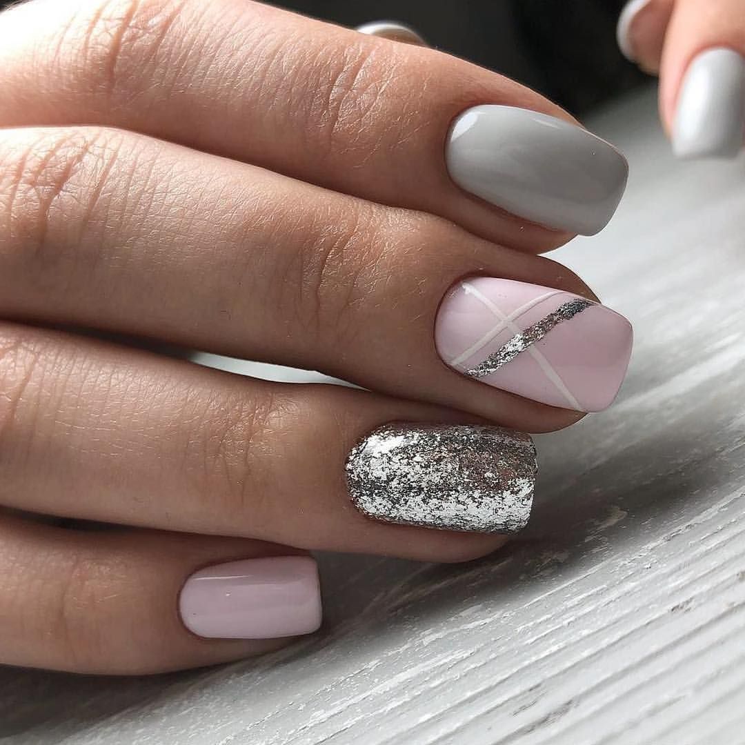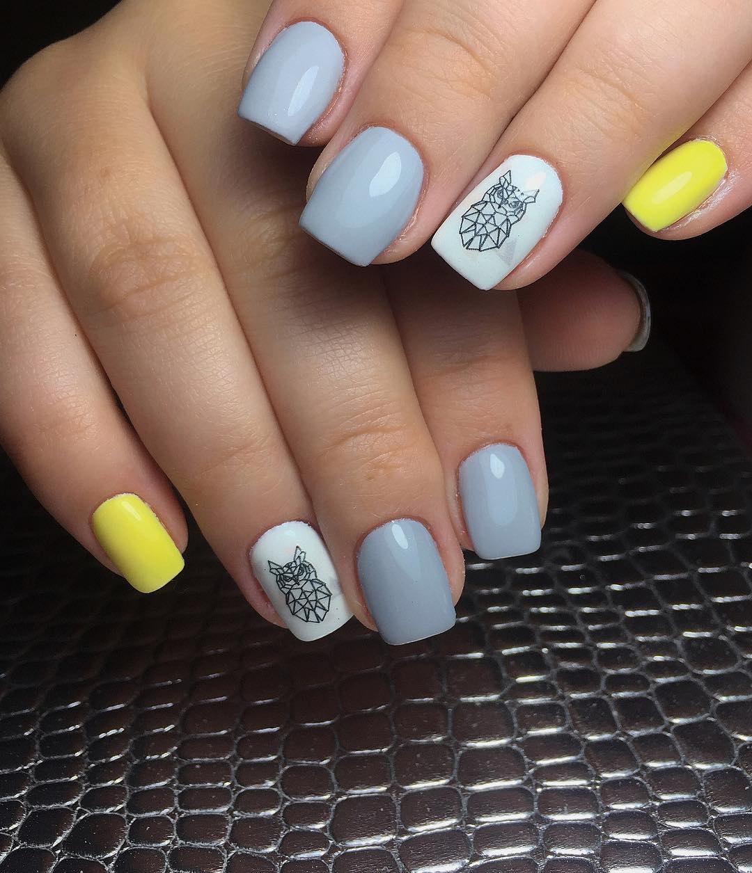 Malgré le fait que les autocollants deviennent progressivement une chose du passé, c'est sur les ongles gris courts qu'ils peuvent avoir le plus de succès. Si vous choisissez un motif dans une palette de couleurs et un style appropriés, vous obtenez un style très féminin et élégant.