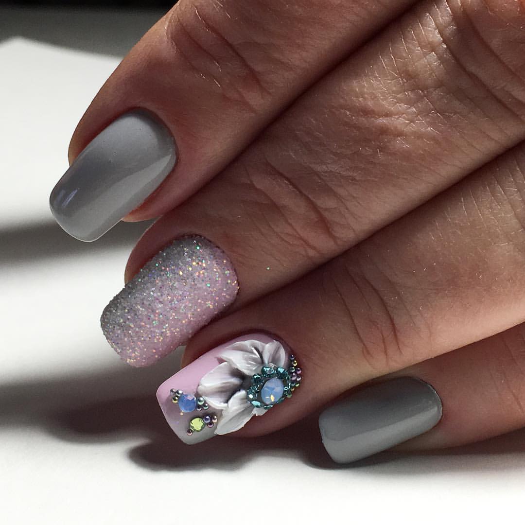 Après tout, la base - une nuance grise - ne permettra pas aux pierres d'avoir l'air trop vulgaires. Dans la communauté mondiale des amateurs de design d'ongles, les favoris ont déjà été identifiés :