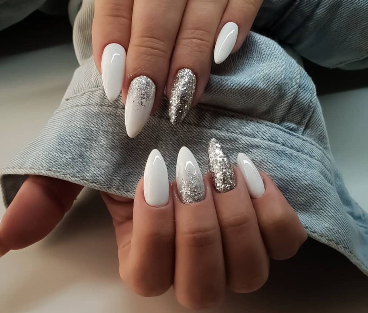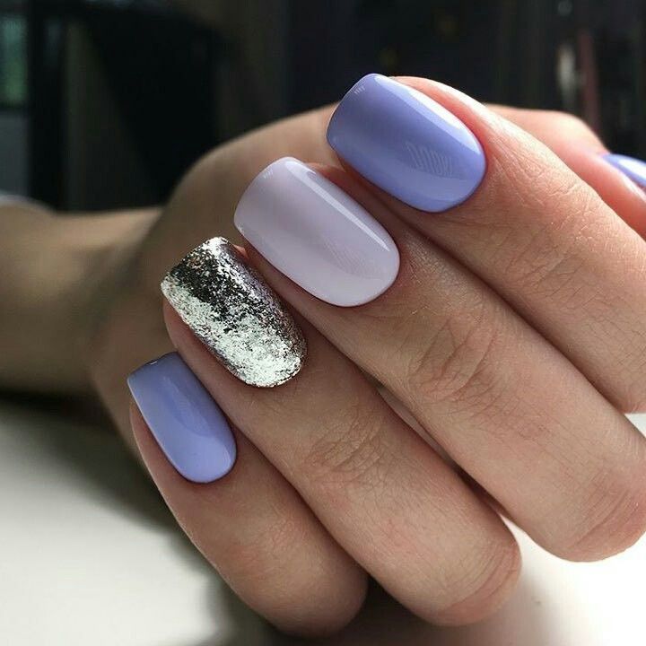 - Création d'un souci d'accent. Ceci est réalisé en décorant un doigt avec des paillettes d'argent et les quatre autres avec n'importe quel vernis. Même si vous utilisez des gels simples, sans design, le résultat sera magnifique. Mais parfois, vous voulez donner une touche à vos stylos. Dans ce cas, le vernis monochromatique est en outre décoré d'acrylique volumineux, frottant, de fines rayures métalliques.