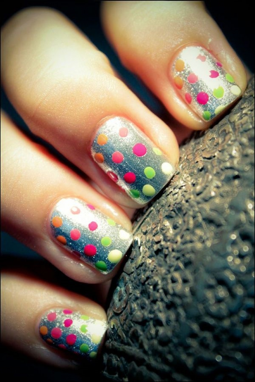 - Vtipné viacfarebné bodky. Bodky sa dajú ľahko vyrobiť na pevnom základe. Môžete meniť ich počet, umiestnenie, veľkosť a odtiene.