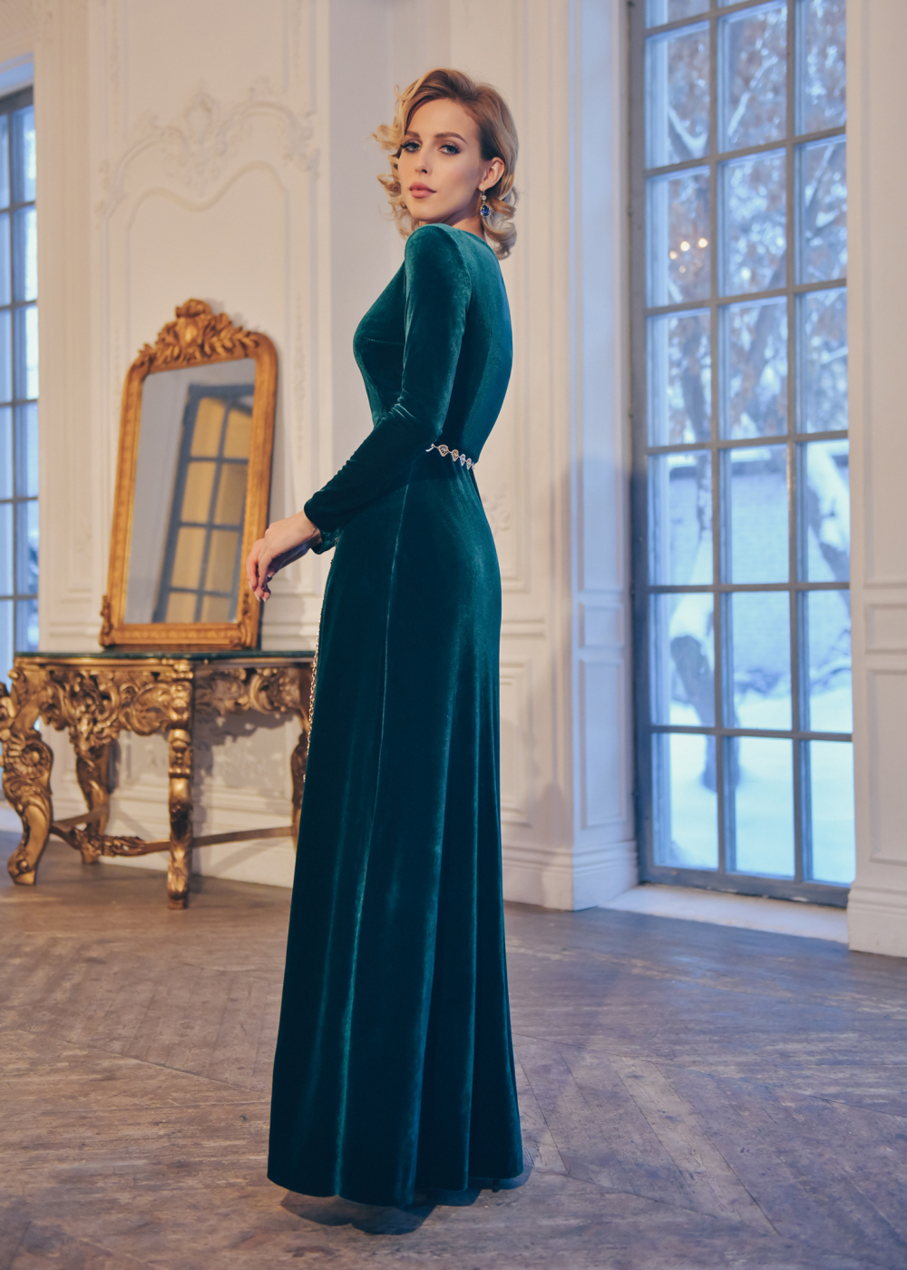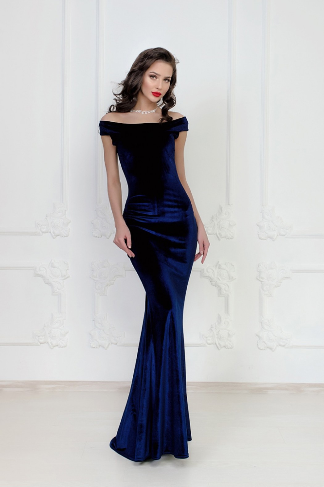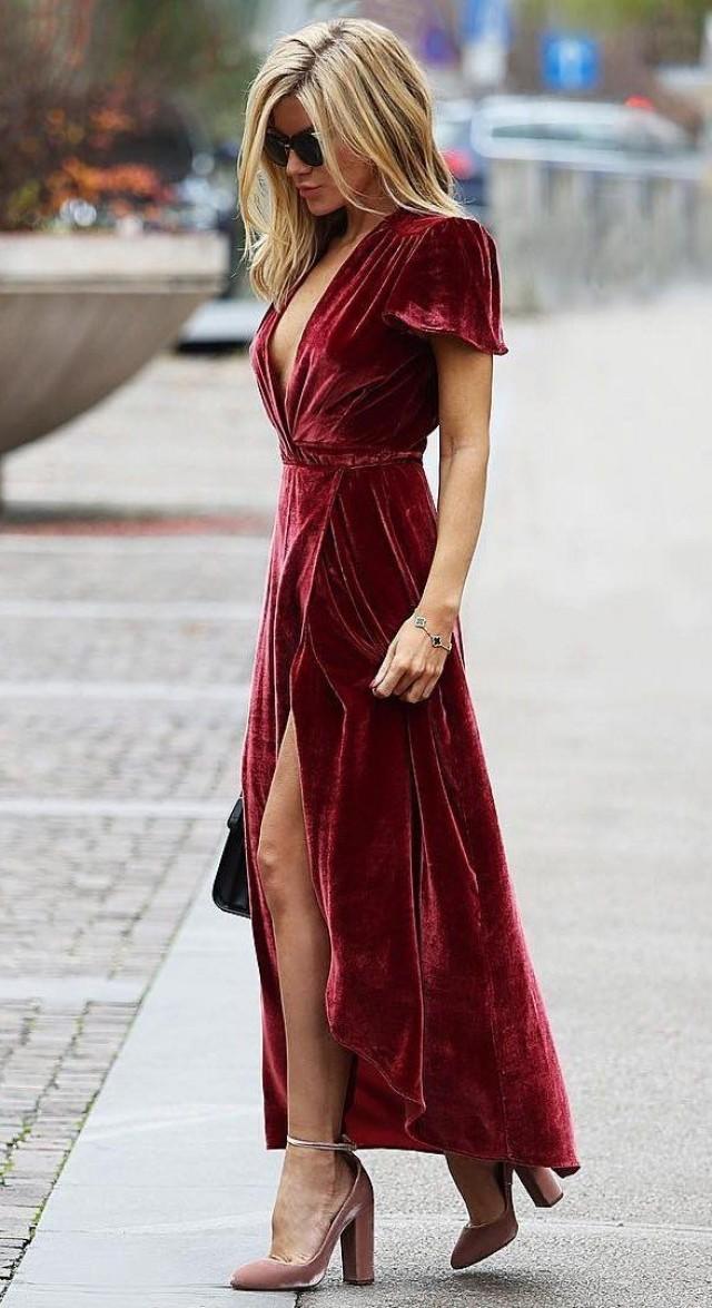 Les options de longueur au sol ont toujours l'air féminines et élégantes. Mais dans le cas d'un tissu aussi doux, comme du velours, la solennité est également ajoutée. Par conséquent, vous devez faire attention aux combinaisons: autant que possible, "étouffez" la lumière avec des vestes, des cardigans ou des vêtements d'extérieur calmes.