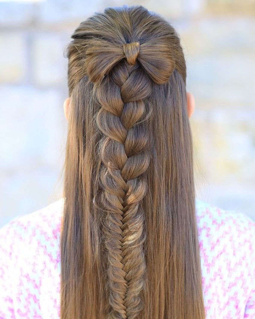 Kiểu tóc thắt nơ không phải phụ nữ nào cũng phù hợp. Khi đó, mũi to, cổ to và cằm nặng nề sẽ trở nên đáng chú ý hơn. Vì vậy, tốt hơn là nên chọn nó cho những cô gái có ngoại hình giống như búp bê. Tùy chọn này cũng được hình thành trên cơ sở các bện xương gai, chỉ chúng được dệt theo kiểu truyền thống. Chia các bím tóc thành ba khu vực bằng nhau và chia theo chiều dọc, tết các bím tóc khoảng giữa đầu.