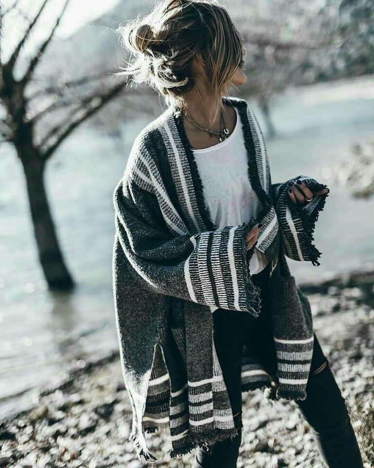 Une autre nouveauté stylée qui a captivé le cœur des filles. Notre choix se distingue des ponchos classiques sur la tête par l'absence de décolleté et d'attaches. Cette tendance est dédiée aux amateurs de s'habiller dans le style grunge et bohème.