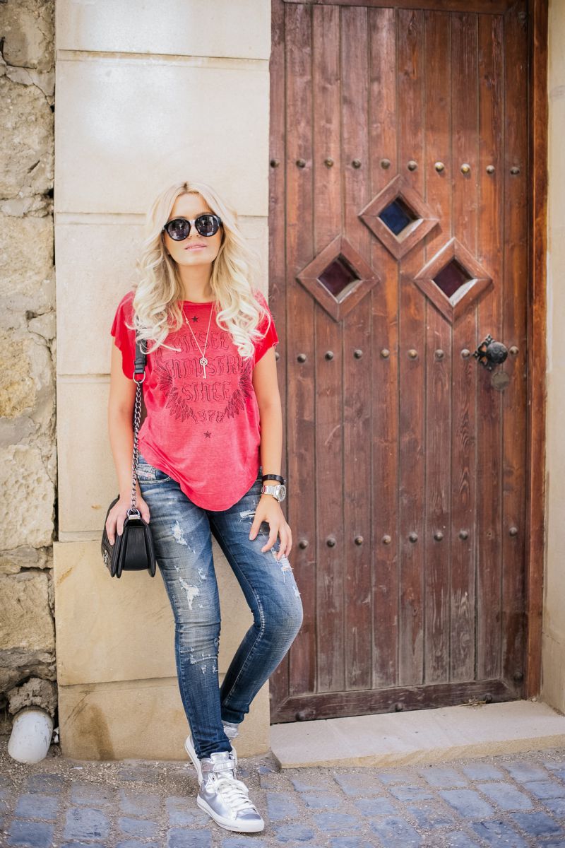 - Par temps chaud, vous pouvez vous débrouiller avec l'ensemble standard - jeans, baskets et t-shirt. Si vous le souhaitez, les jeans peuvent être remplacés en toute sécurité par une jupe pare-soleil qui atteint la cheville.